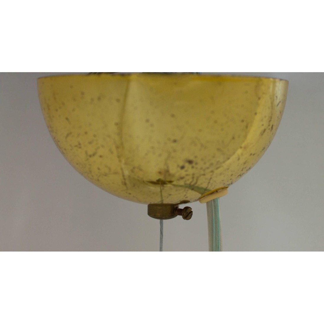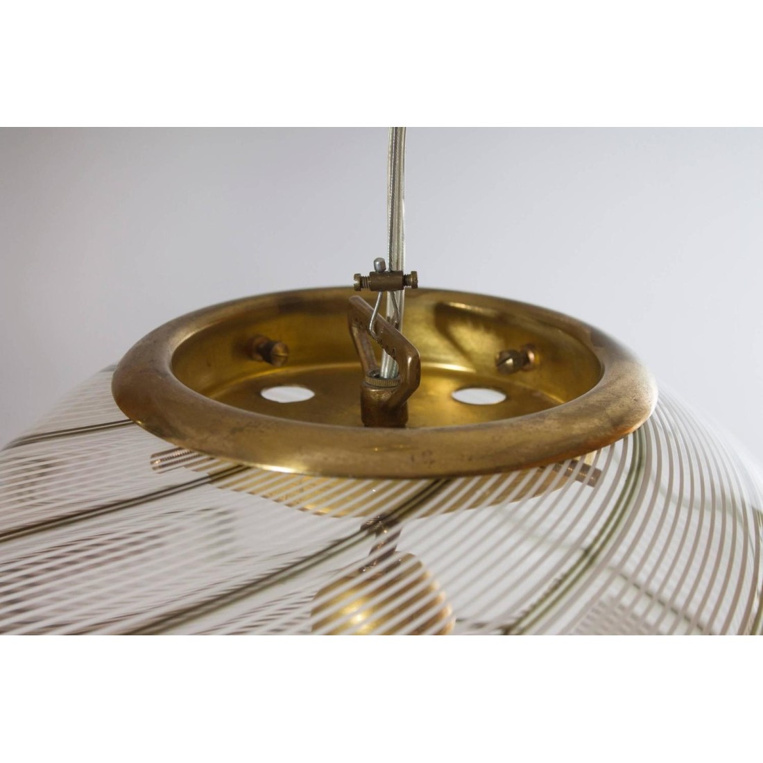 Italian Venetian sphere, in blown Murano glass, attributed Venini, 1960s. Italian Murano handmade glass sphere, in excellent original condition ( as shown in the pictures) attributed to Venini, circa 1960s, in colour transparent with white and grey twisted lines called "Filigrana ", with an original brass frame with a steel cotton that connects the glass sphere with the canopy of the ceiling. The chandelier has one light, and an height adjustable until a 63 inches, and having 14 inches of diameter. It is entirely handcrafted in blown Murano glass, in the Venetian Murano Island, the manufacturing is attributed to Venini. We offer for free the rewiring of the chandelier based on your country''s specifications. In addtion to that, also the polish of the brass framework.