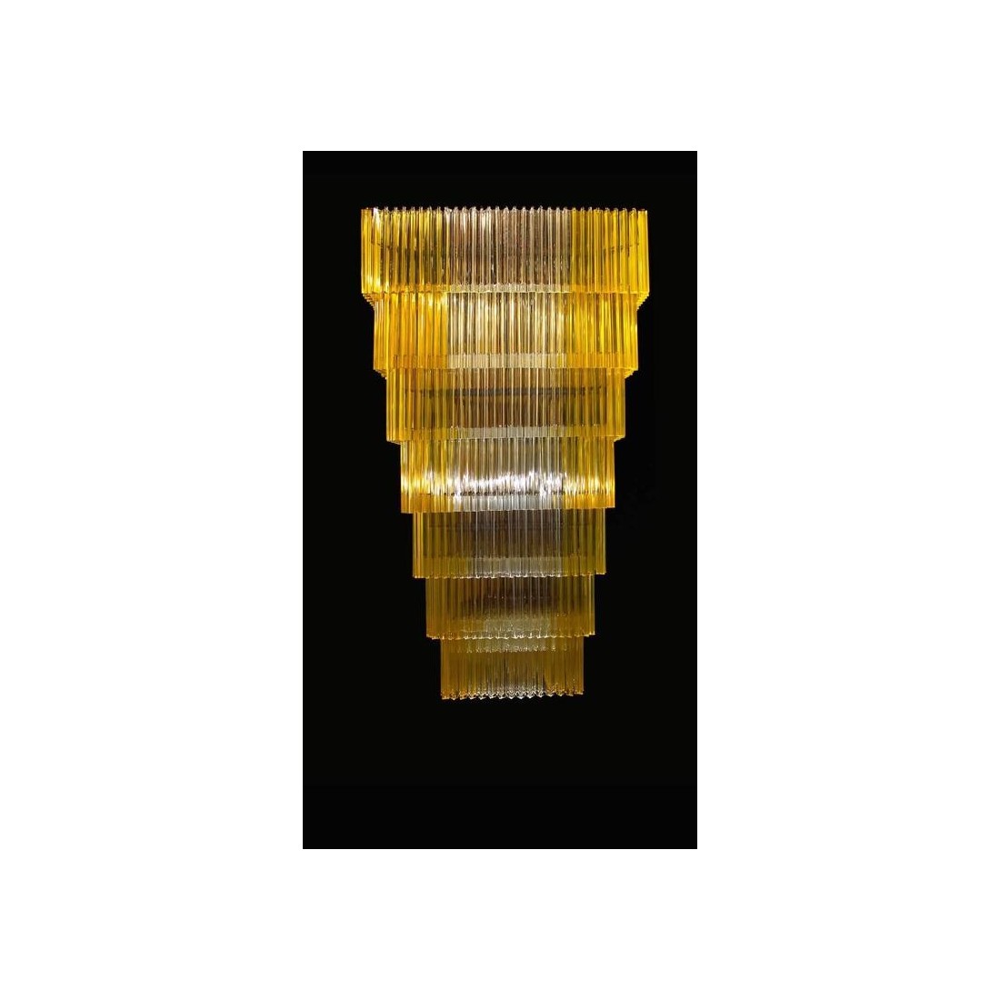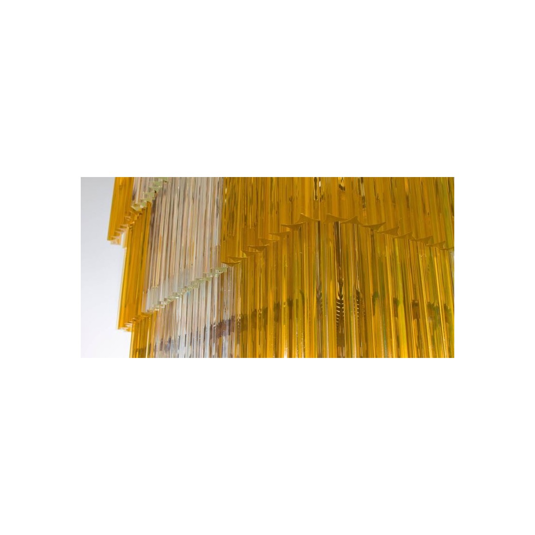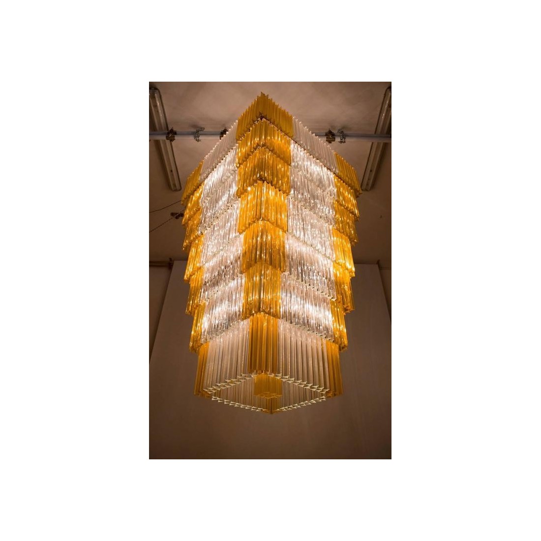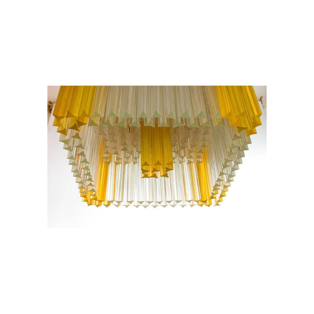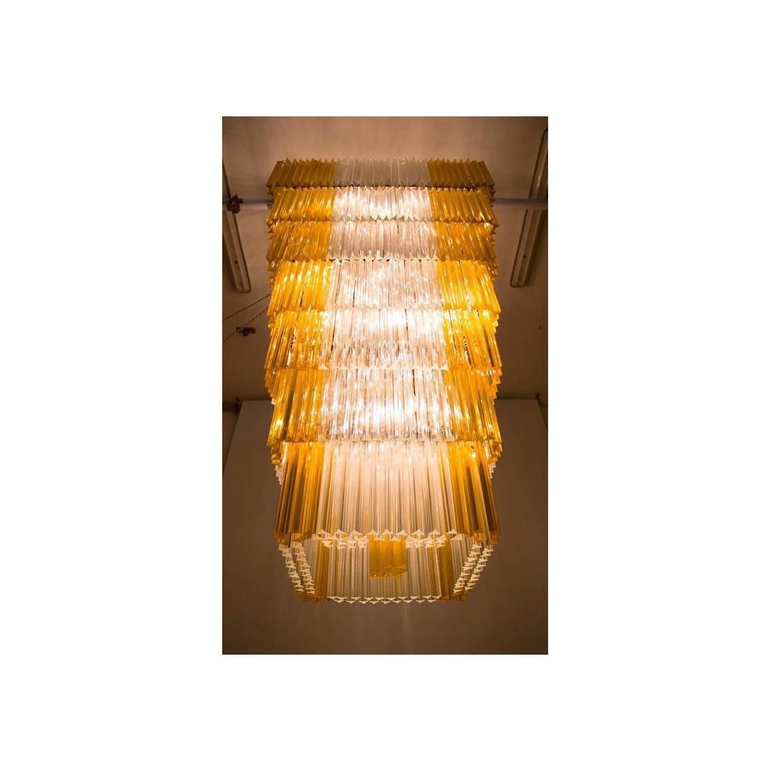 Spectacular and amazing Italian Murano chandelier, attributed to Venini, circa 1960s, composed at the corners from Triedro elements with amber soul, and in the middle part from transparent Triedro elements, disposed in a phenomenal shape Cascade with a square base. The bottom and the center part of the chandelier are composed of long glass Triedro elements, while the middle part is composed from short glass Triedro elements, this creates a wonderful and amazing moved effect on the chandelier. All is supported by an original vintage rust frame. The chandelier is 79 inches high, 44 inches deep by 44 inches wide and has 48 lights. We can professionally rewire this item to your country's specifications, and re-chroming the frame in brilliant chrome.