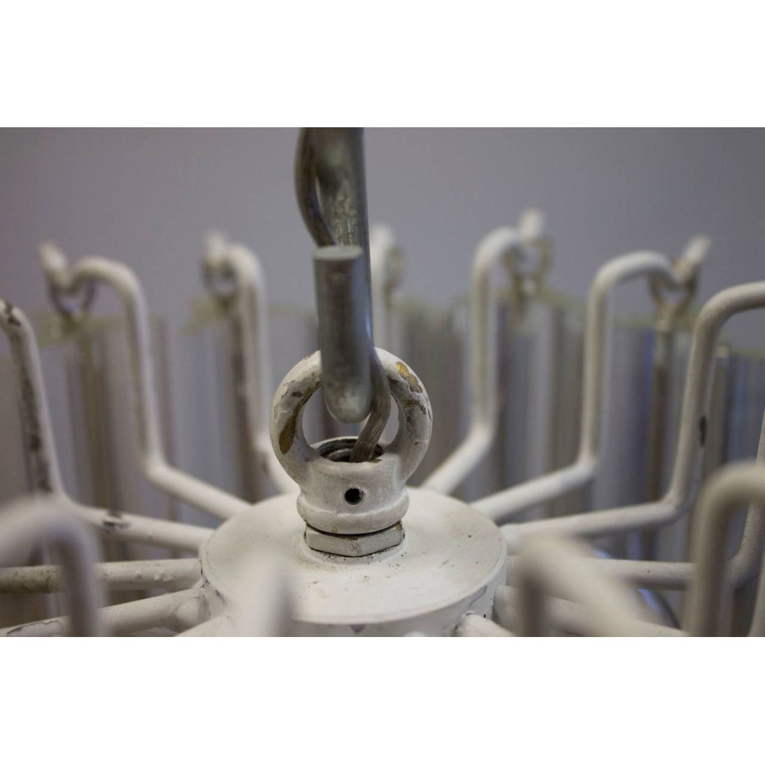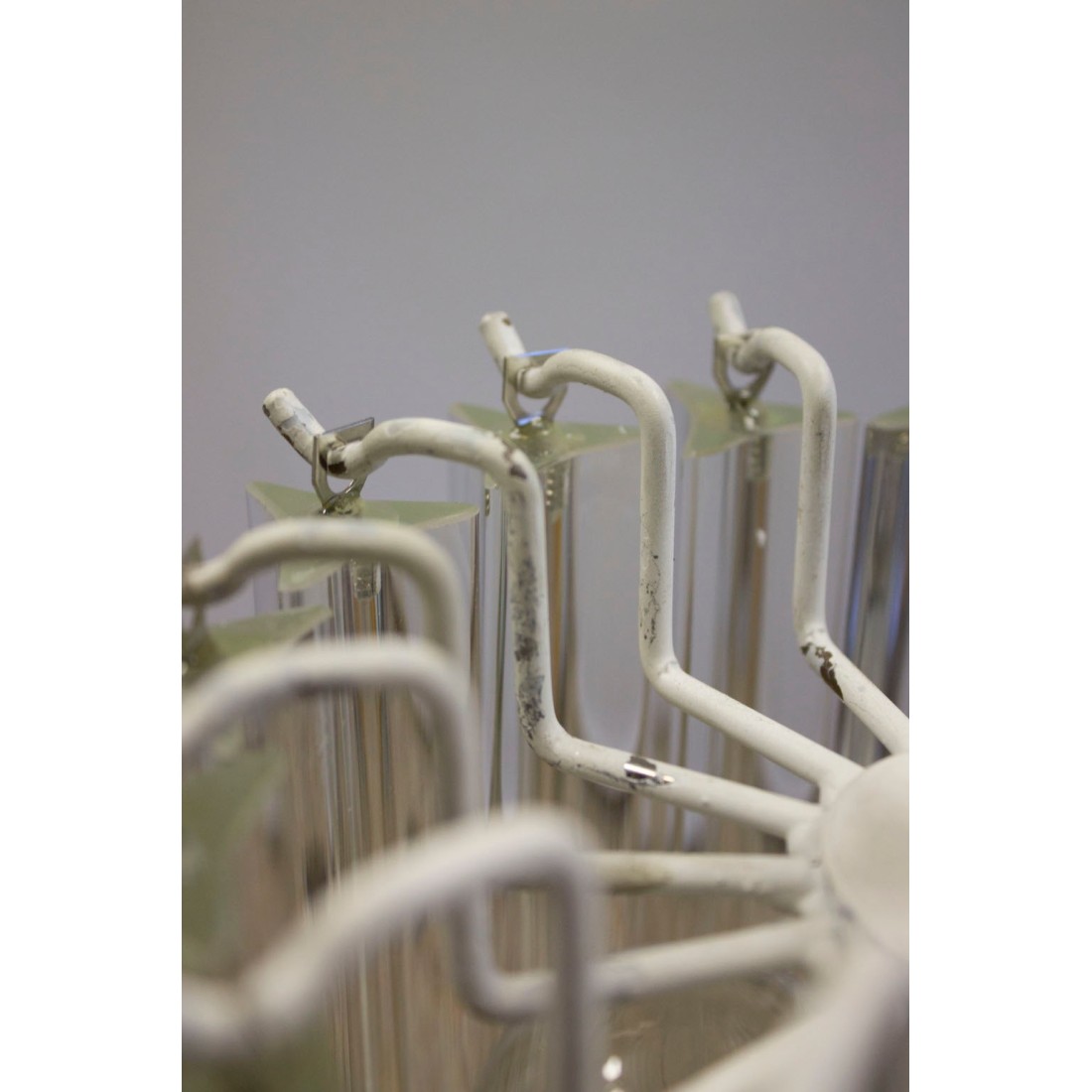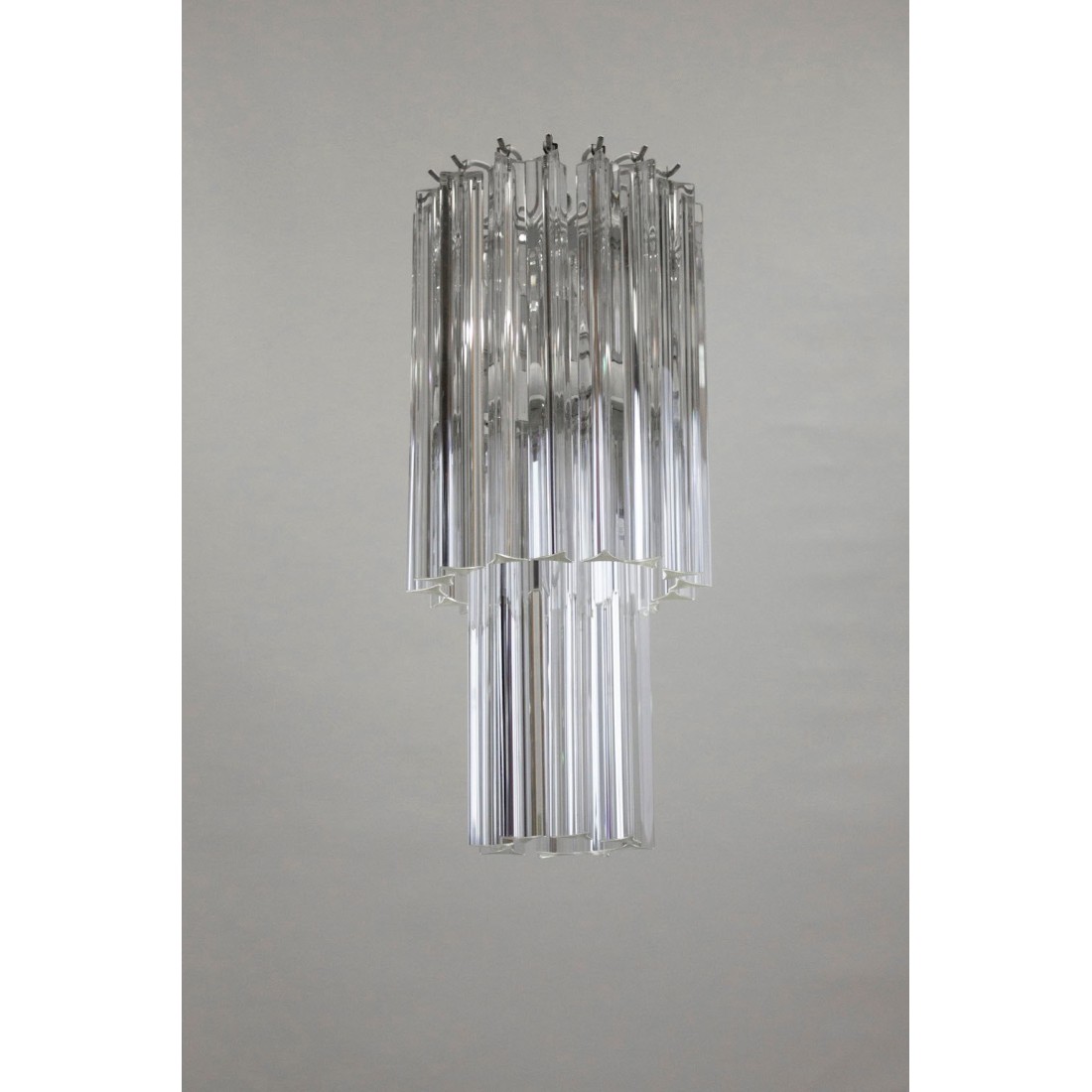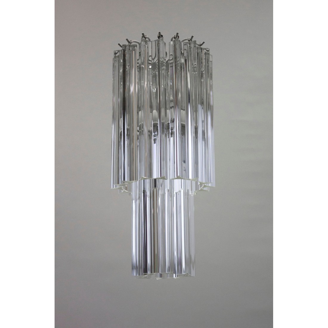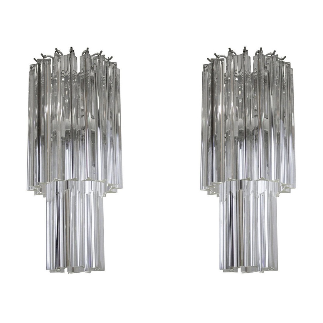 Italian Venetian pair of chandeliers, blown Murano glass, triedro elements, attributed to camer glass, 1960s Amazing pair of Murano chandeliers in excellent original condition, as documented in the attached pictures, attributed to Camer Glass, circa 1960s. The chandeliers are handcrafted, entirely manufactured in blown Murano glass, composed by elegant transparent triedro elements, with a white coloured framework. Each chandelier is 15 inches high, by 8 inches diameter and having three lights. We offer for free the professional rewiring of both chandeliers, based on your country''s specifications.
