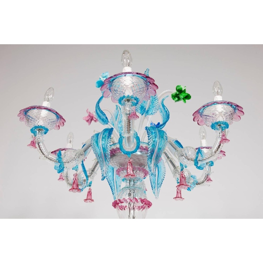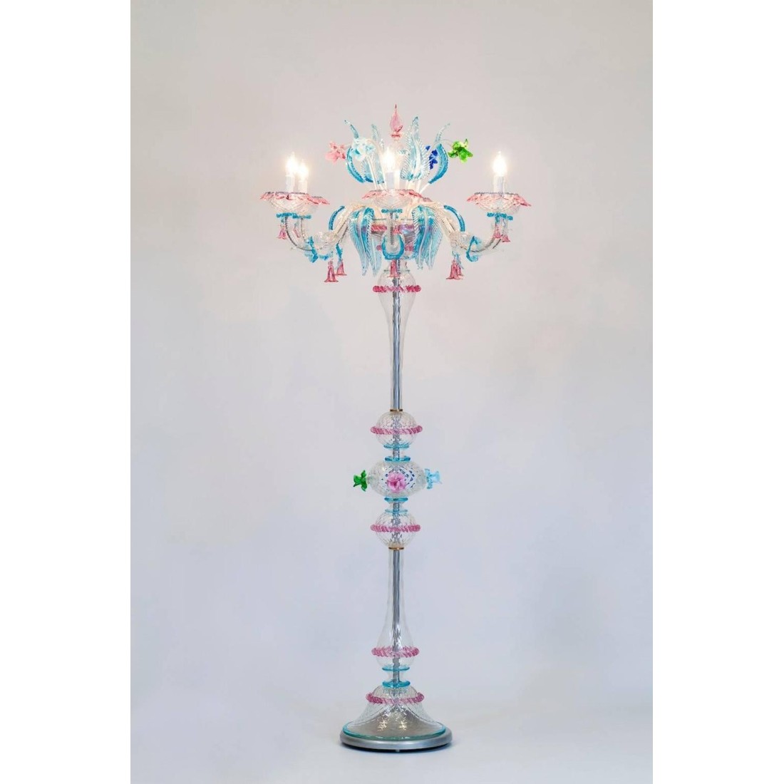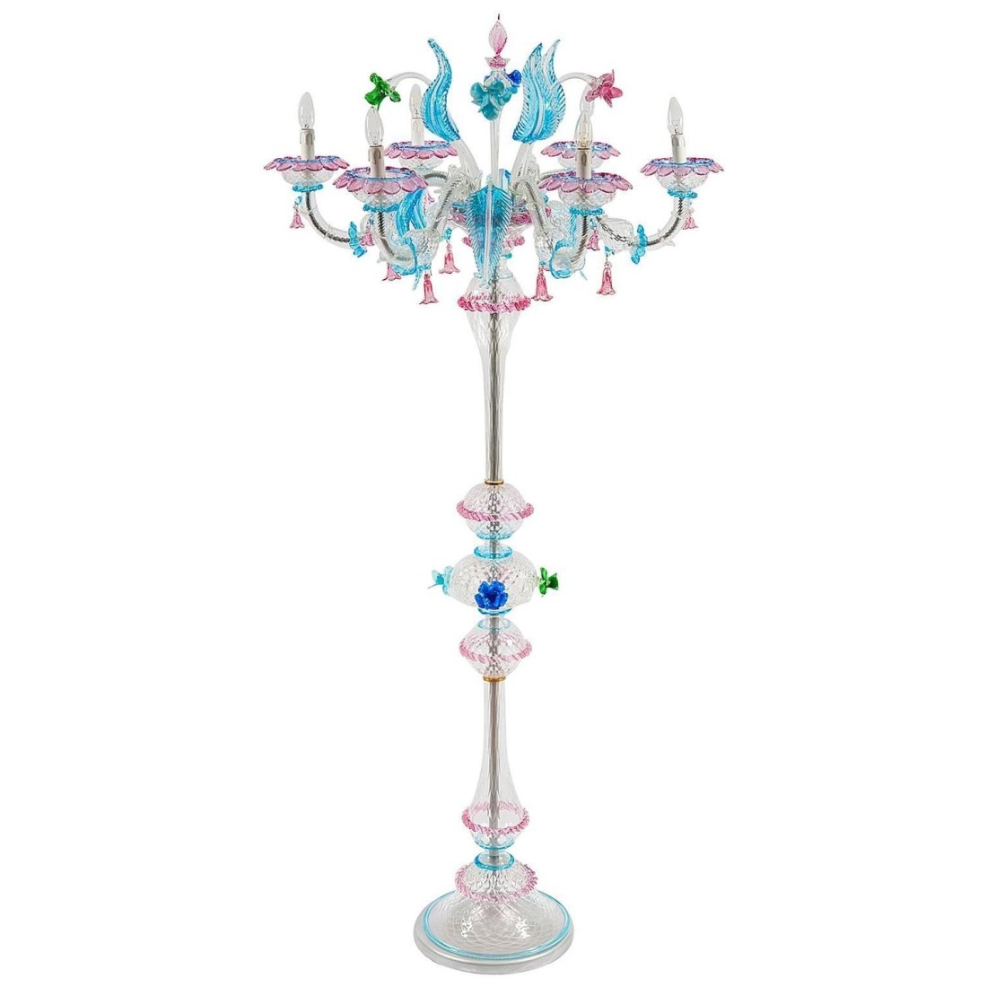 Rezzonico floor lamp with coloured flowers in blown Murano glass Italy 1990s. Italian Ca''Rezzonico floor lamp, in very excellent original conditions, dated 1990s. This beauty is made up of a main stem with in the middle a sphere to create a double section. Three flowers in paste colours and in the upper part from a garden with six arms and by six high and low leaves and by three high flowers in paste colours and with in the middle a pyramid. The floor lamp is 74.81 inches high by 31.50 inches diameter and having six lights. It is entirely handcrafted in the Murano island in Venice, by a local artist. The professional rewiring is part of the courtesy service.