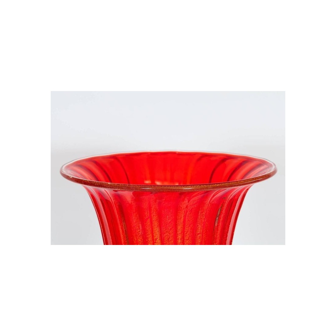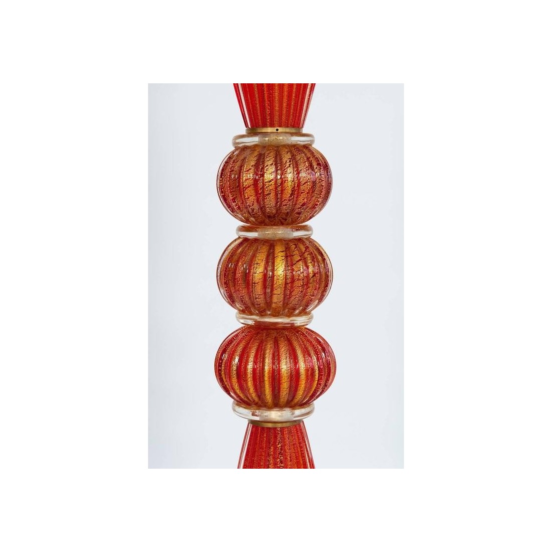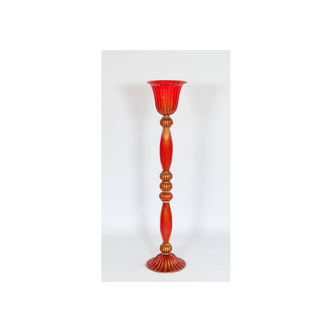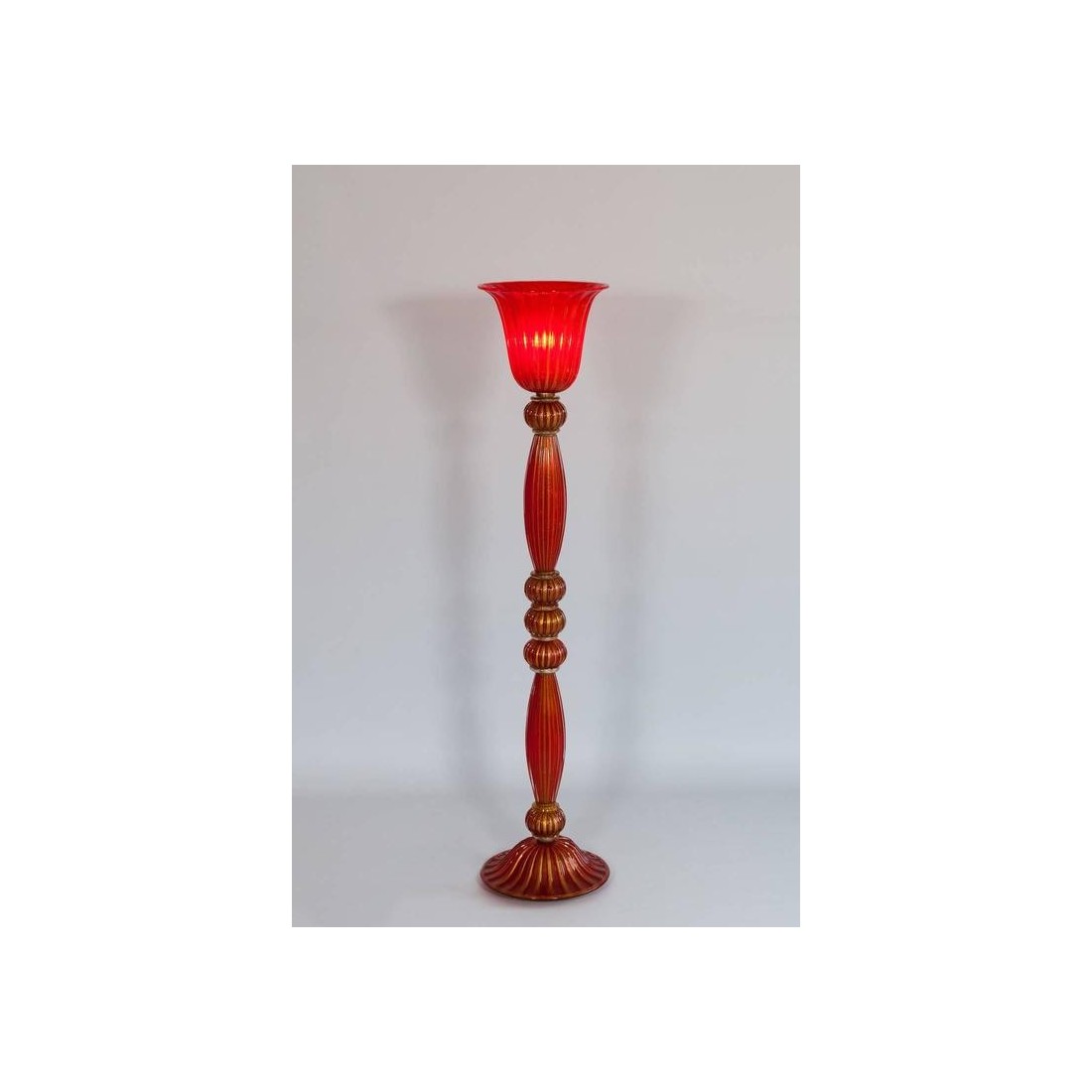 Red Floor Lamp with gold finishes in blown Murano Glass 1980s Italy This is an exquisite classic floor lamp from 1980s entirely handcrafted from the Venetian glass artists. This floor lamp is compsed by a single stem alternating long olives as they area called in the specific terminology and rond spheres till the very top where a huge cup is allocated. One light is at the top of the floor lamp. The floor lamp is in very excellent original conditions as documented in the attached pictures. The professional rewiring is part of the service.