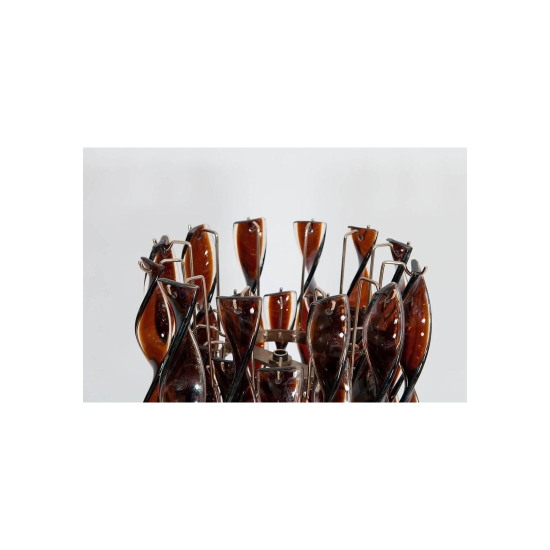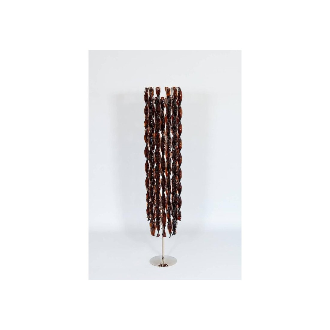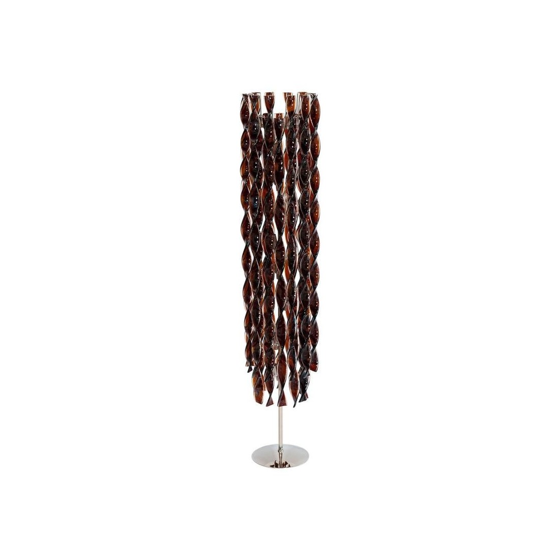 Italian Floor Lamp in blown Murano Glass with twisted tobacco-coloured and clear elements, 1980s. Modern, Unique and Elegant Italian Venetian, Floor Lamp, in blown Murano Glass, with twisted tobacco-coloured elements and transparent finishes, 1980s. This amazing floor lamp is a unique piece of art, composed by long twisted glass bars in blown Murano glass, in tobacco colour with transparent finishes. The Murano glass bars are set at two different levels, generating an additional metaphoric movement to the entire floor lamp. A robust and modern chromed framework supports and joins together all the glass elements in a unique and elegant floor lamp The floor lamp was entirely handcrafted, and made of blown Murano glass elements. It was manufactured and created in the Venetian Murano Island by the local professionals of the blown Murano glass art. Its manufacture is dated 1980s. Six lights are set in the floor lamp body, to generate a very bright environment. This fantastic twisted floor lamp is in excellent conditions, as documented in the attached pictures. We offer for free the professional rewiring based on your country''s specifications.