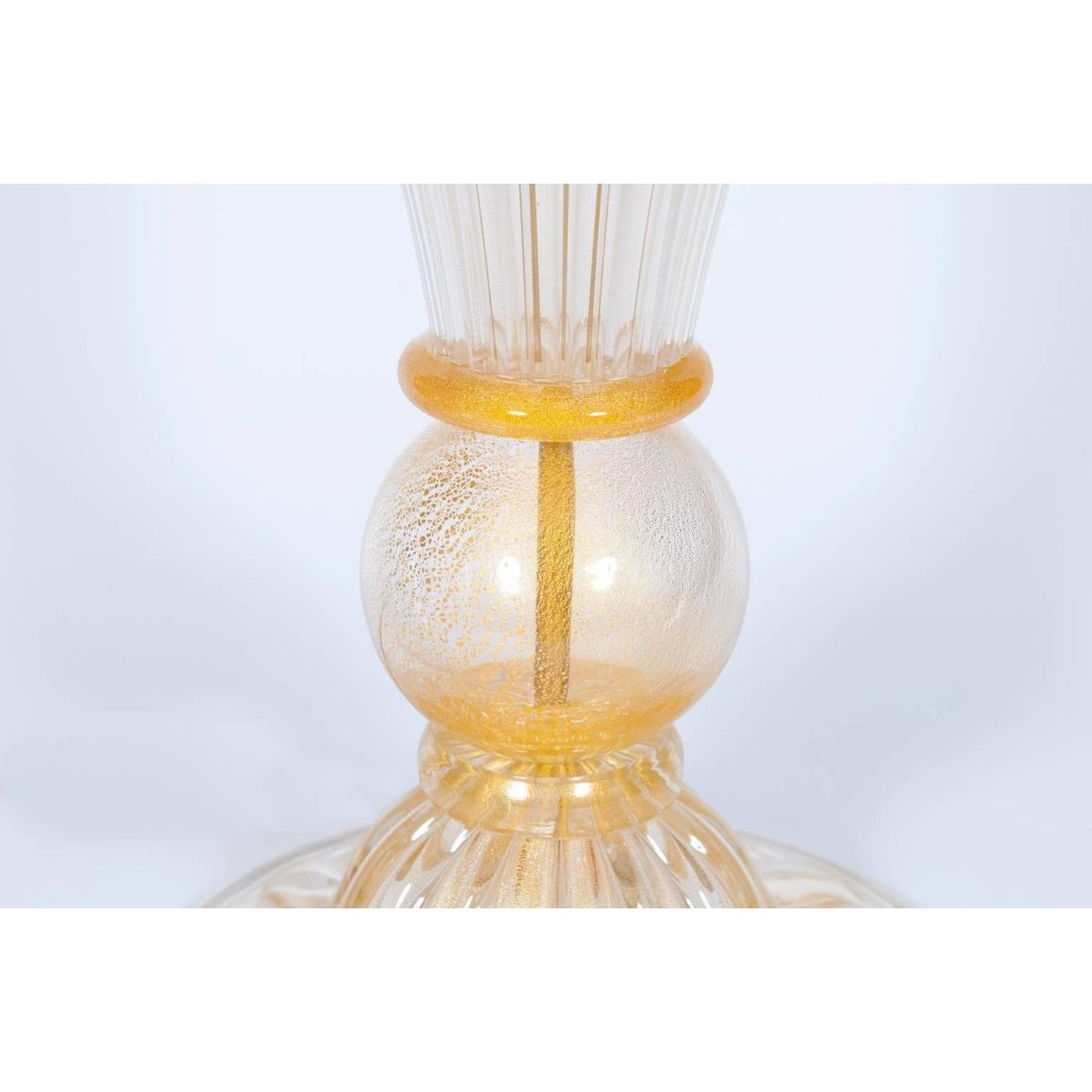 Italian Venetian Murano gold table lamp in very excellent original condition, attributed to Seguso circa 1970s, composed by a striped base and by two spheres with in the middle a striped bowl, and within top a base for the bulb holder. The table lamp is 28.35 inches high, by 9.65 inches diameter and having one-light. The professional rewire is part of the service. Lampshade is also customized, it is possible to chose one from a selection.