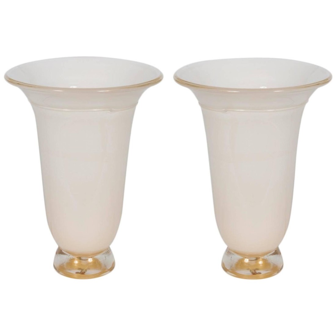 Italian Venetian, pair of table lamps, in blown murrain glass, white and gold, 1980s. This is a unique set, of handcrafted blown Murano glass table lamps, in a shape of a vase, white milk color submersed in a gold thin layer of gold, that provides an elegant feature. They are entirely handcrafted and designed in the Italian Venetian Murano island, their manufacture is dated 1980s, and their design is attributed to Barovier. The set of table lamps is a portrait in a very excellent conditions as documented in the attached pictures. Inside each table lamp, a there is a single bulb power by a wired cable. As courtesy, we offer for free the rewiring of the table lamps, based on your country specifications. The table lamps are 14.57 inch high, by 10.63 inches diameter, and having one lights.