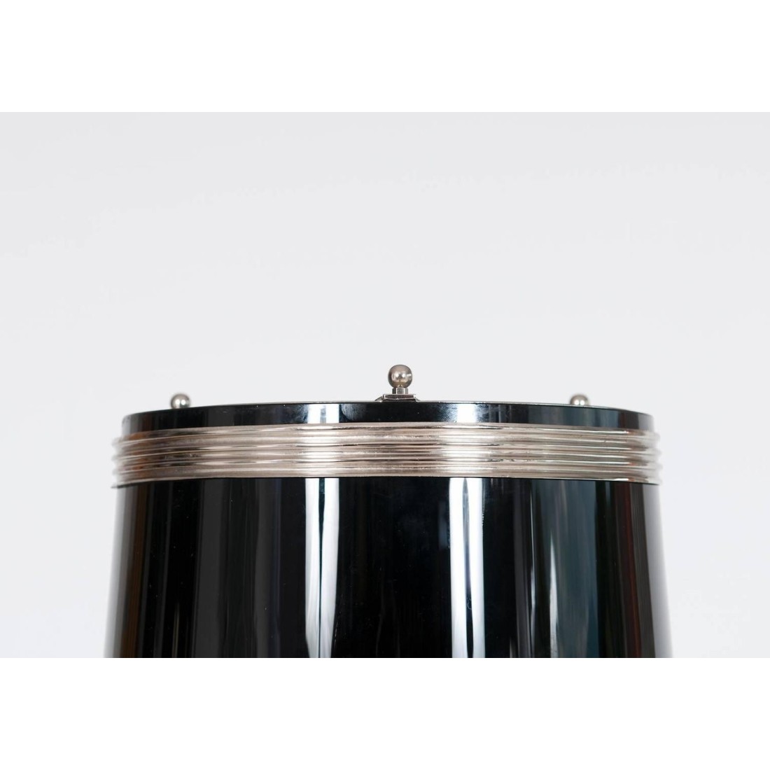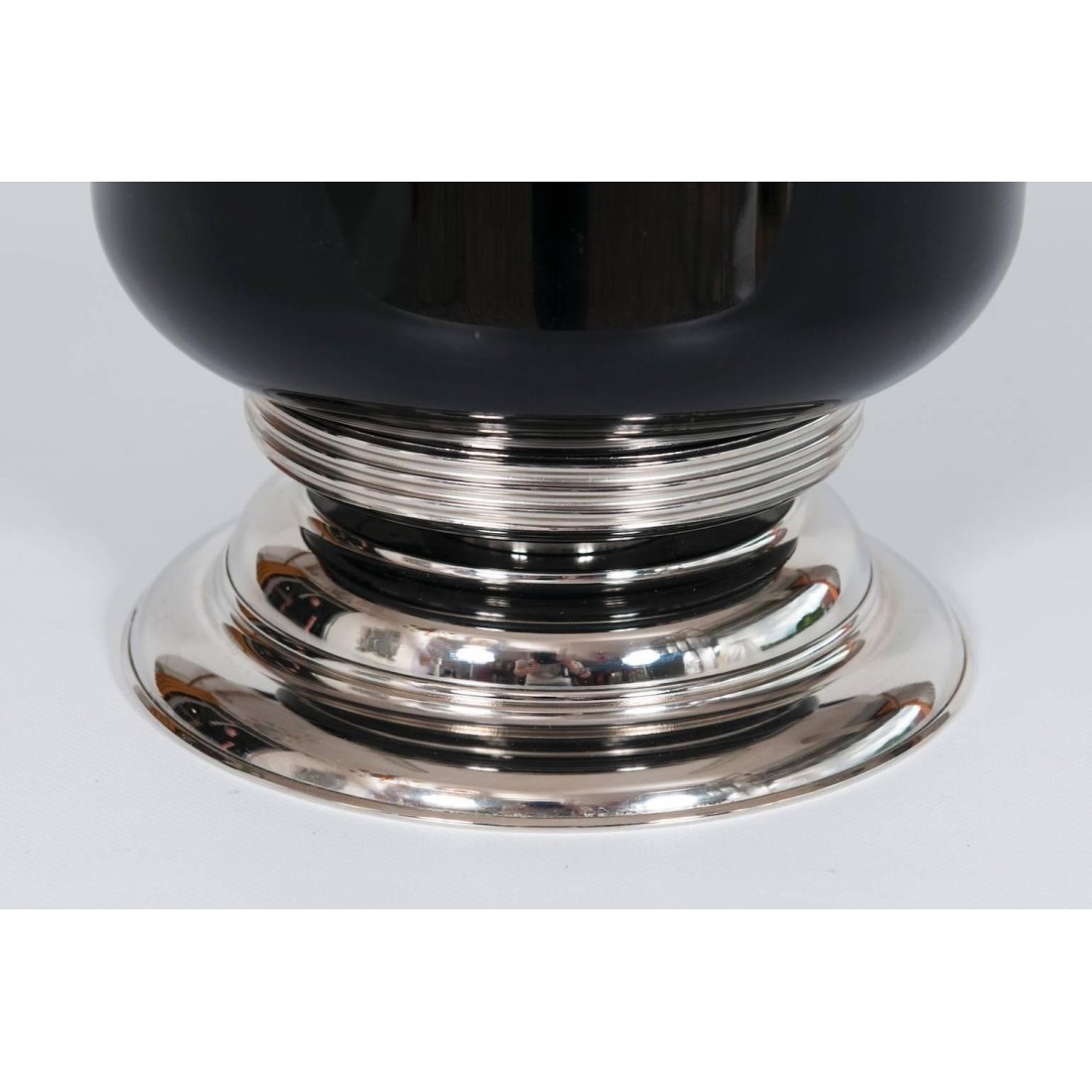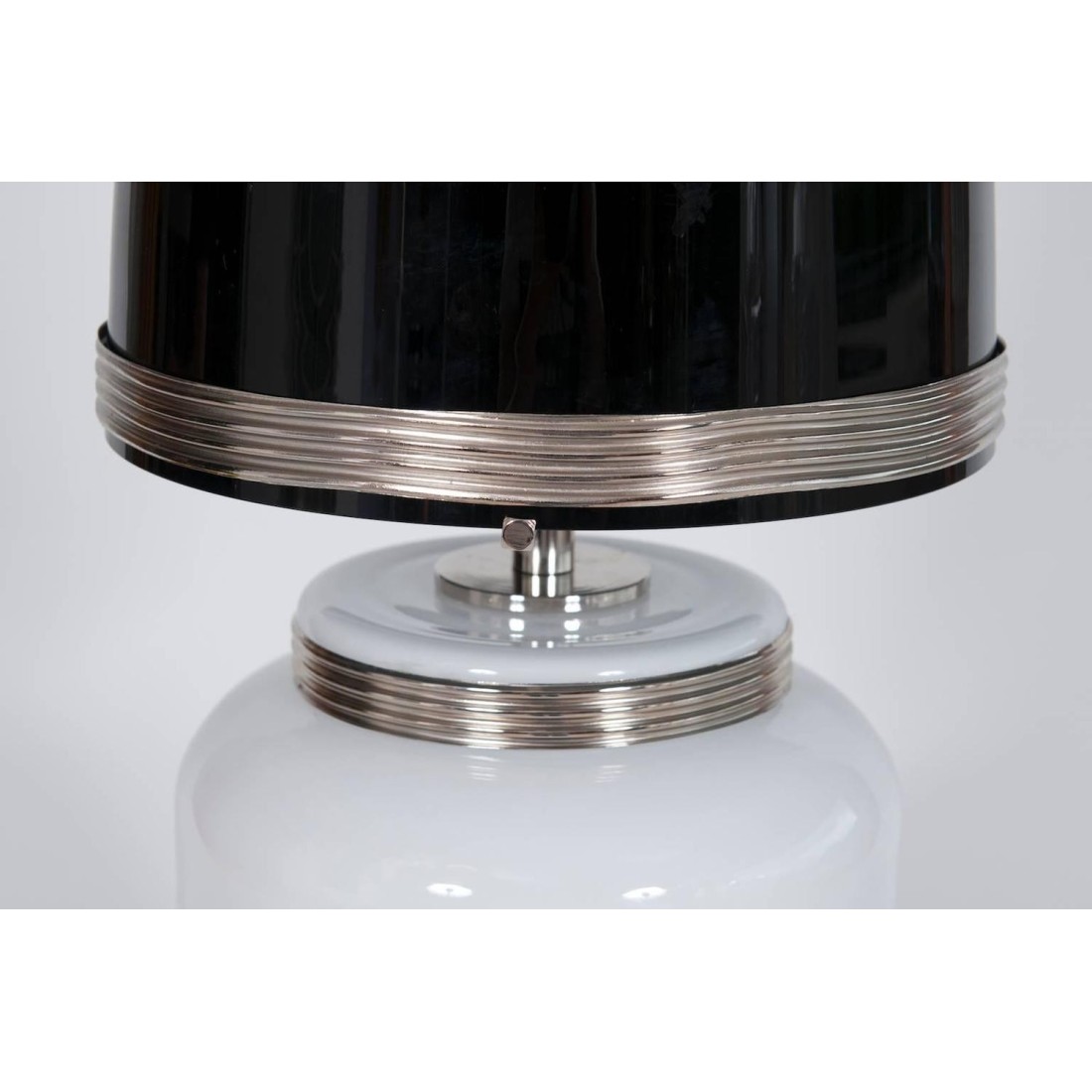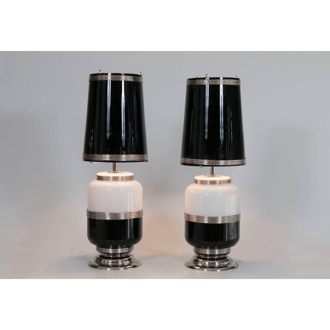 Pair of amazing and rare Italian Venetian Murano glass table lamps, in very excellent original condition, entirely realized in blown and handcrafted glass in the Venetian Murano island circa 1960s, composed by a stem in black and white glass, with in the middle a chromed stripe, and by an elegant cone lampshade in black outside and white inside entirely in Murano glass too. Four lights inside the lampshade, all is supported by a particular frame in chrome. The table lamps are 32.28 inches high by 11.02 inches diameter and having four lights. We can professionally rewire this item to your country's specifications.