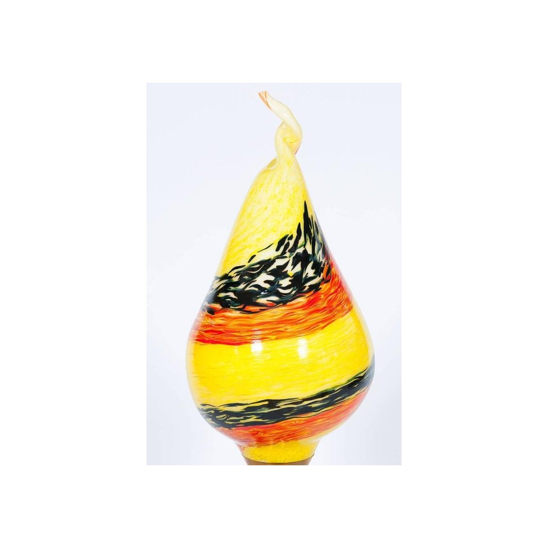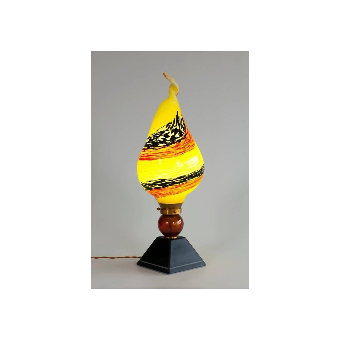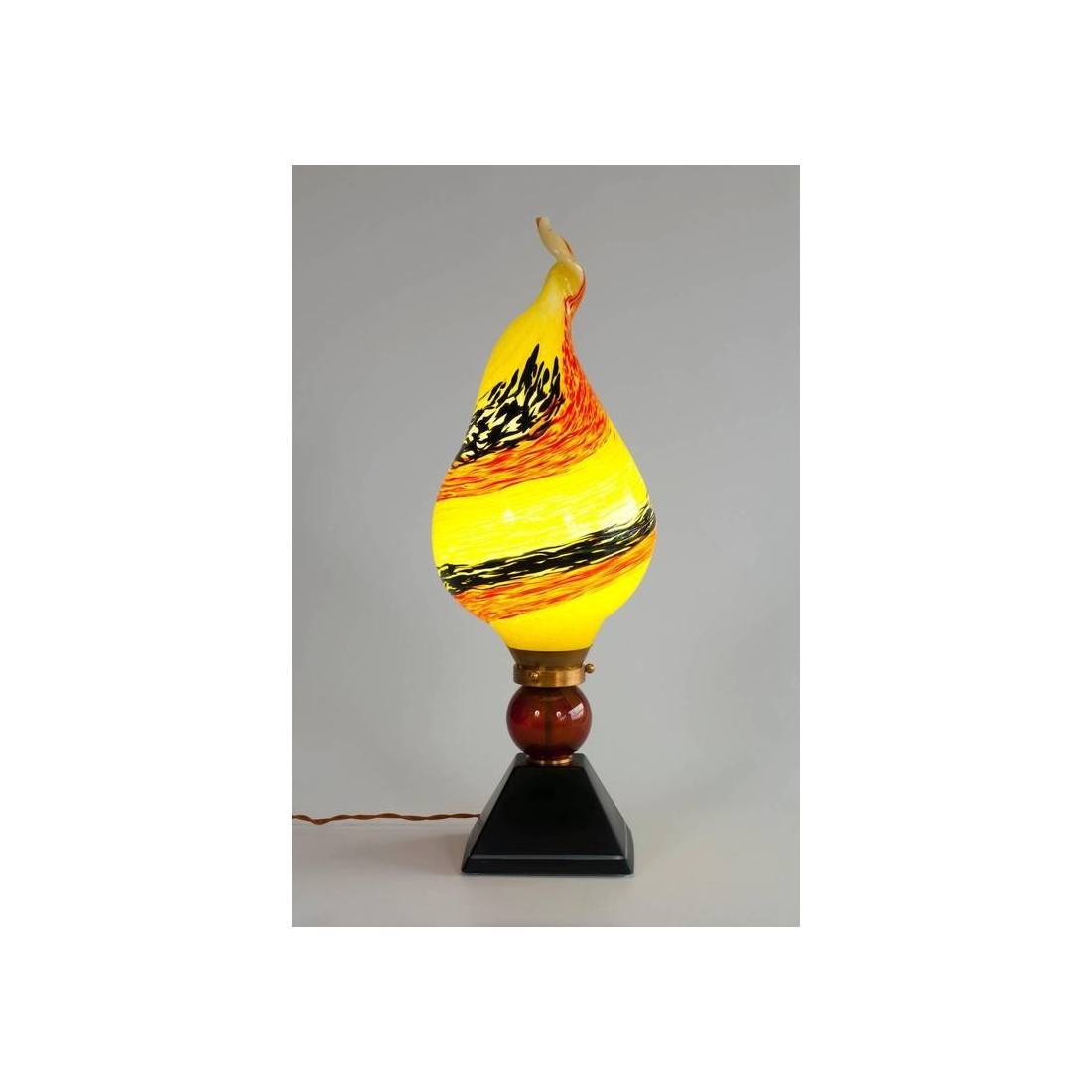 Very Unique, and Elegant, Italian Venetian, Flame Table Lamp, blown Murano Glass, yellow orange black in pasta, composed by a black basement with a white line finishes, followed by a red and gold sphere, and culminating with a huge flame in blown Murano glass, in pasta glass, in yellow with two twisted stripes in black and orange, with a twisted tip, all enclosing a bulb. This work of art is made by the Italian artist Giovanni Dalla Fina. This is not a simple table lamp, but it is also an abstract lightning sculpture, representing a Flame containing a bulb, this is the reason why it is called Flame Table Lamp; this portrait has an extremely superior level of detail as shown in the picture. This is certainly a unique production. The entire table lamp is supported in an elegant brass frame. The entire table lamp, is handcrafted in blown Murano glass, manufactured in the Murano island in Venice. Its manufacture is dated 1980s. The table lamp is in very excellent conditions, as documented in the pictures. The professional rewiring of the item, based on your country's specifications is part of the service.