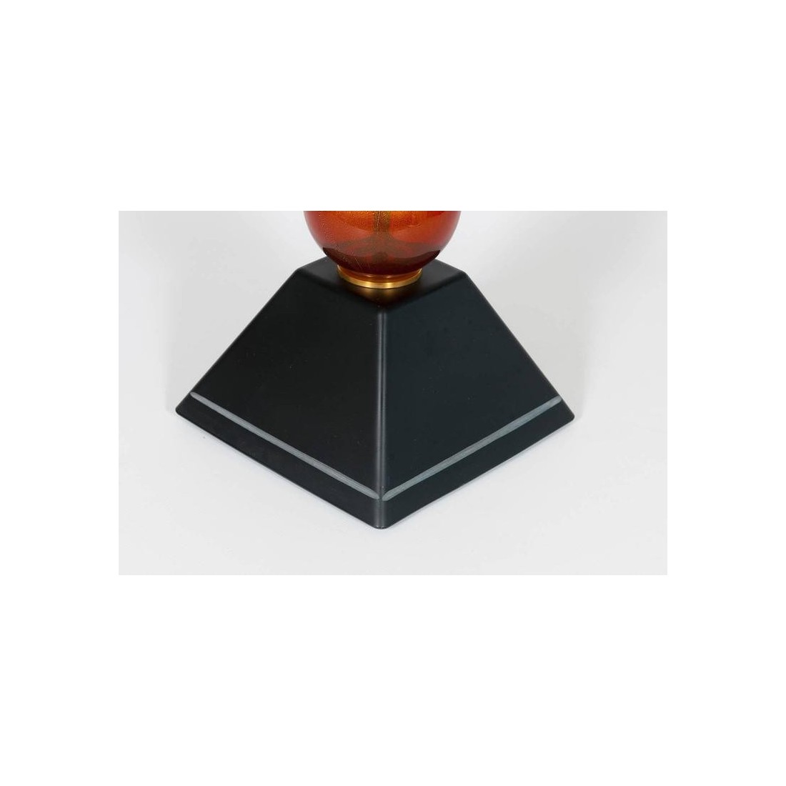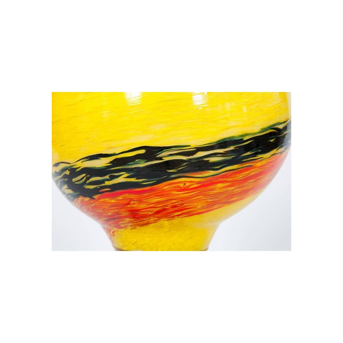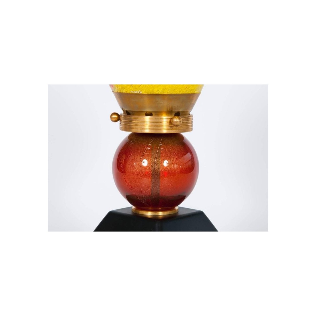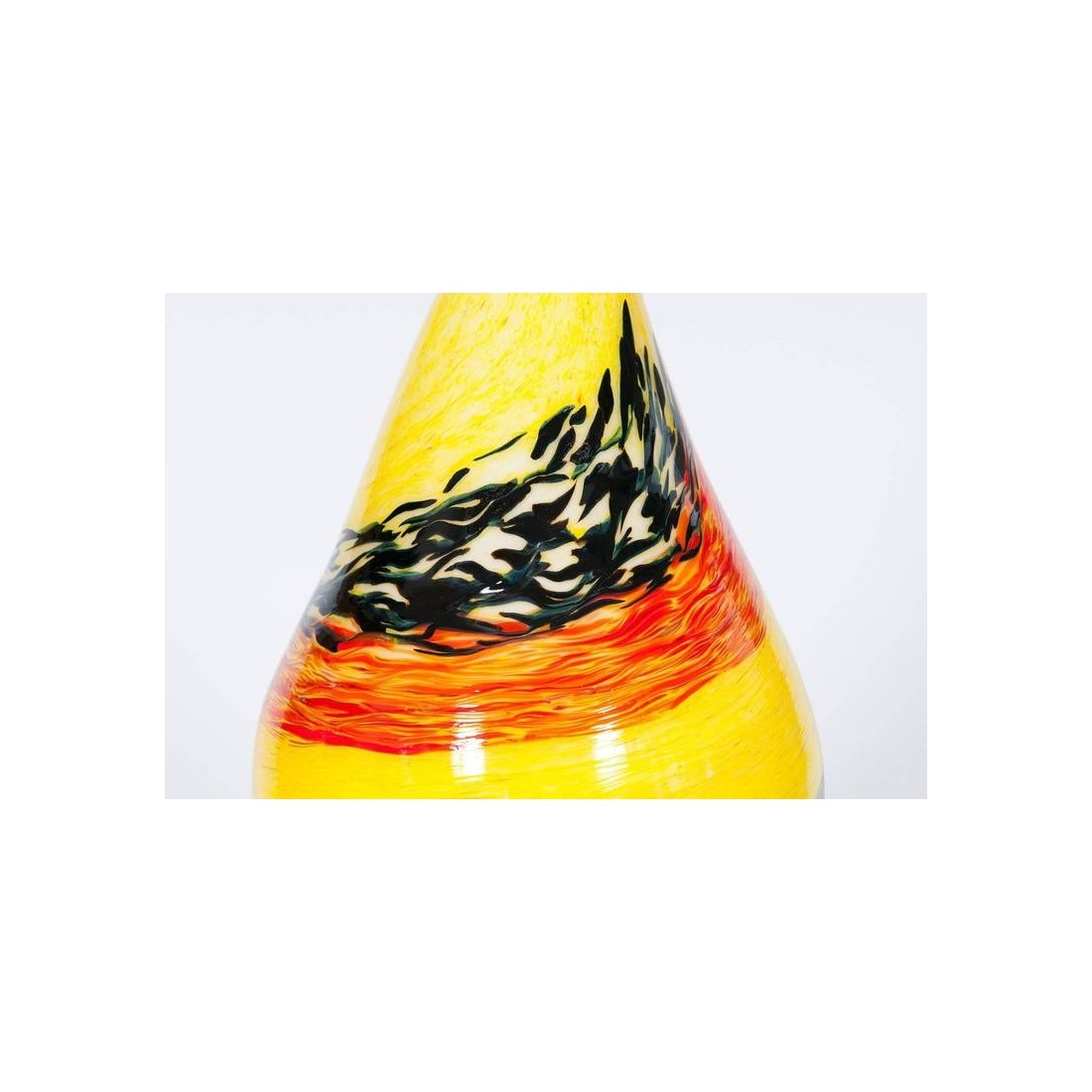 Very Unique, and Elegant, Italian Venetian, Flame Table Lamp, blown Murano Glass, yellow orange black in pasta, composed by a black basement with a white line finishes, followed by a red and gold sphere, and culminating with a huge flame in blown Murano glass, in pasta glass, in yellow with two twisted stripes in black and orange, with a twisted tip, all enclosing a bulb. This work of art is made by the Italian artist Giovanni Dalla Fina. This is not a simple table lamp, but it is also an abstract lightning sculpture, representing a Flame containing a bulb, this is the reason why it is called Flame Table Lamp; this portrait has an extremely superior level of detail as shown in the picture. This is certainly a unique production. The entire table lamp is supported in an elegant brass frame. The entire table lamp, is handcrafted in blown Murano glass, manufactured in the Murano island in Venice. Its manufacture is dated 1980s. The table lamp is in very excellent conditions, as documented in the pictures. The professional rewiring of the item, based on your country's specifications is part of the service.