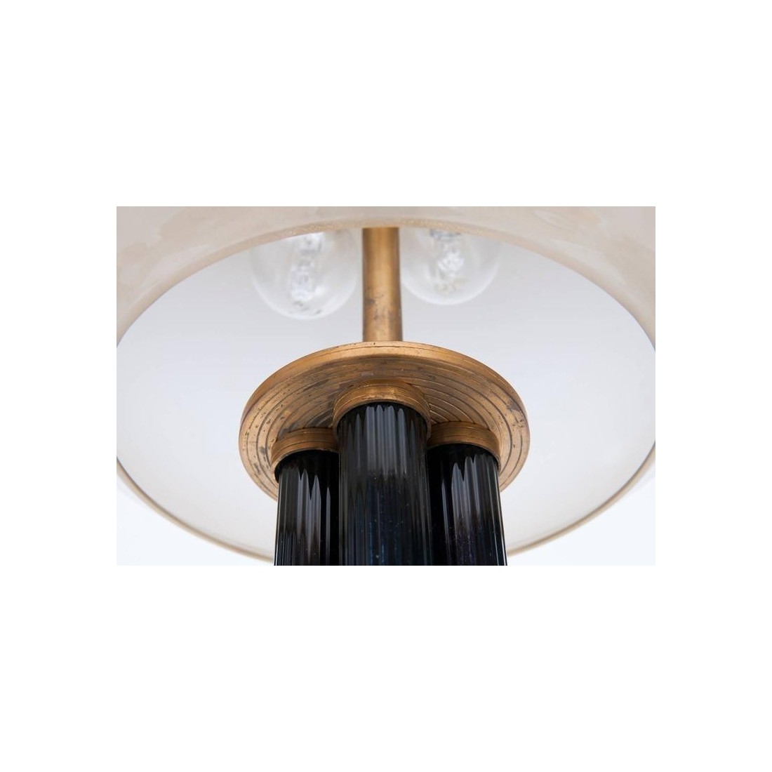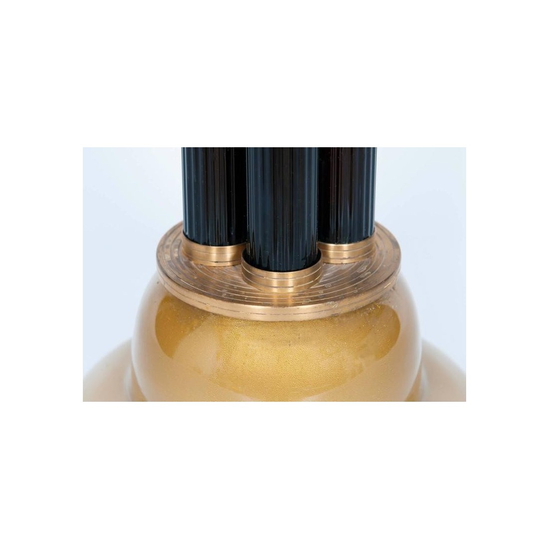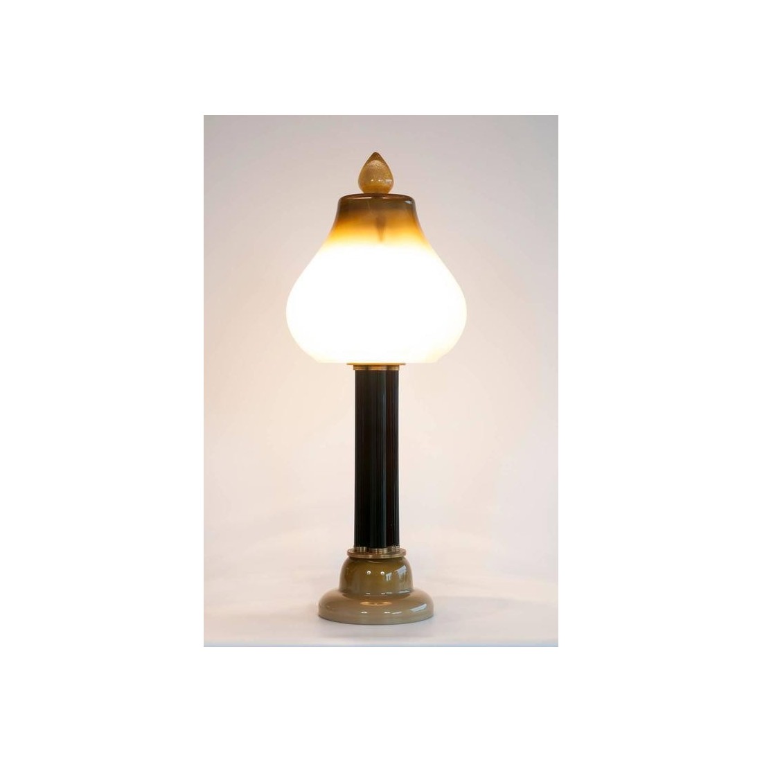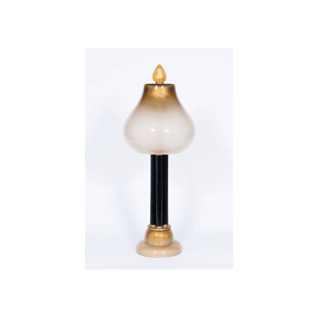 Elegant Italian Venetian, Table Lamp, blown Murano Glass, white & gold, 21st. This is an amazing and unique, table lamp, entirely handcrafted in blown Murano glass. The table lamp is composed by few columns surrounded by a particular handcrafted framework, and allocated in a very elegant basement in blown Murano glass in yellow gold white color. At the top of the columns, the lampshade in blown Murano Glass, having gold finish and at the very top, a gold drop handcrafted in gold. This portrait has been entirely manufactured in the Italian Venetian Murano island, and the design is Vintage Murano Gallery production, dated 21st. The table lamp, is in excellent conditions, as documented in the attached pictures. It will be our care to provide you the item, completed rewired based on your country specifications.