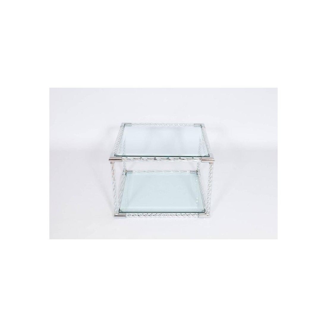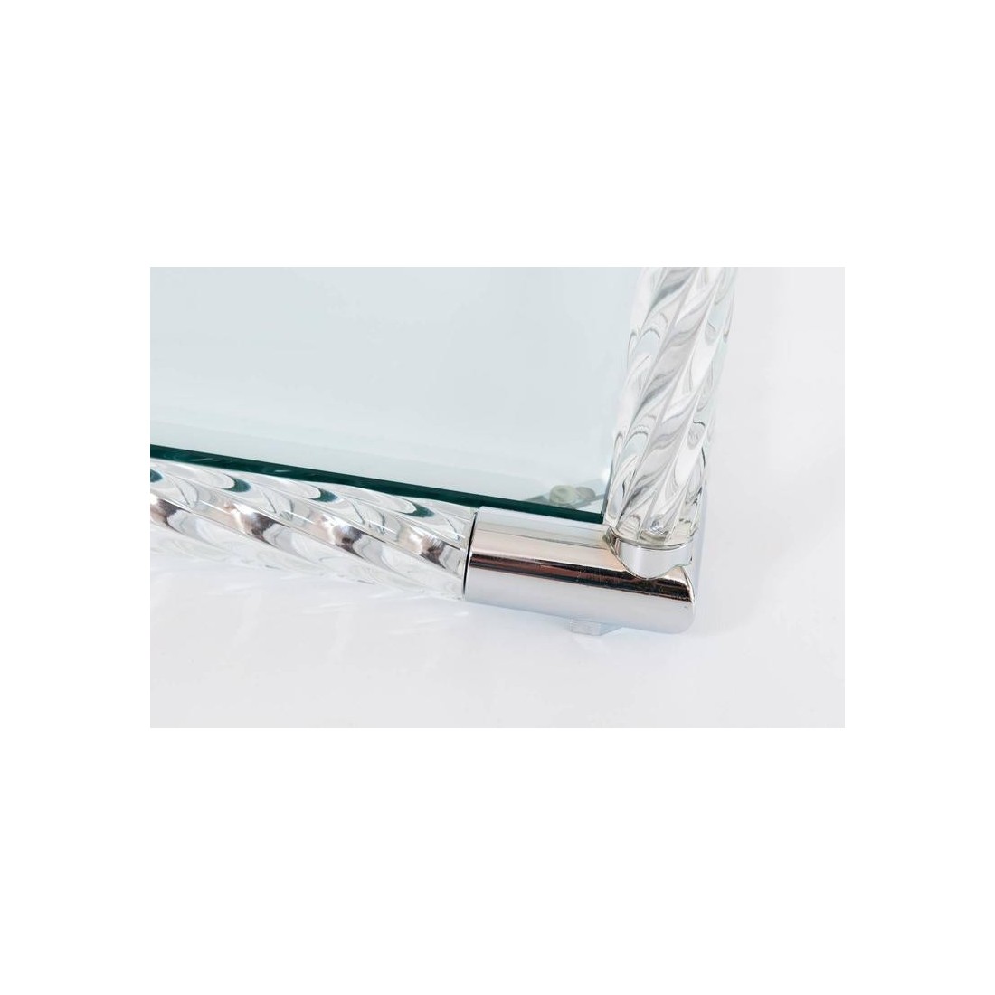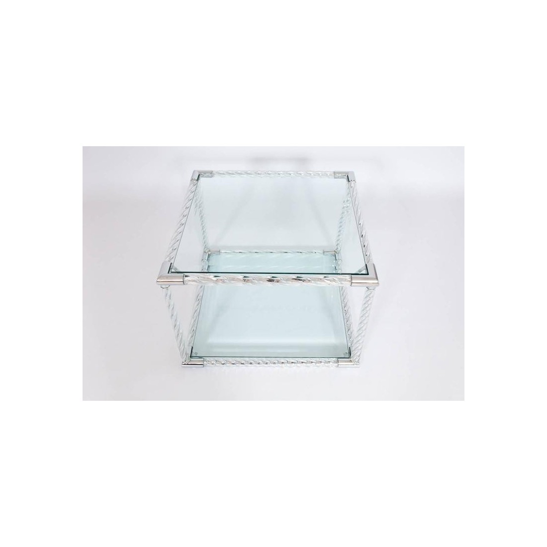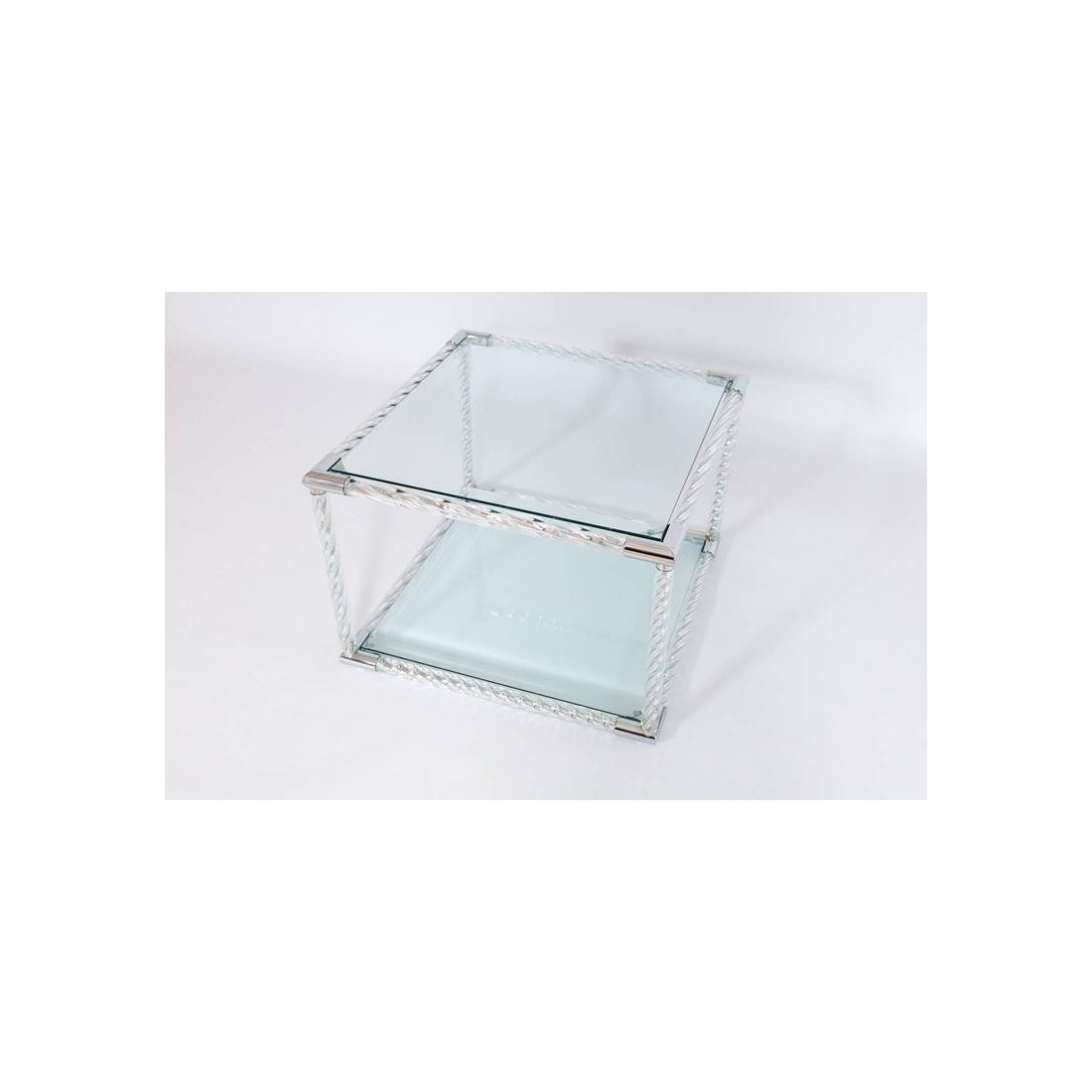 Exquisite Squared Coffe Table in Blown Murano Glass clear color and chromed finishes Italy, by Giovanni Dalla Fina. This is an exclusive coffe table entirely hand crafted in blown Murano glass, designed and manufactured by the italian artist Giovanni Dalla Fina. This is sofa table or coffe table in modern style, having cubical shape, made up of twisted blown Murano glass elements, in clear color allocated in a chromed frame. The masterpiece is composed by two levels with a flat glass in each of them. This amazing art piece, is also a customizable item, in shape color and characteristics. This is an exclusive limited edition, in excellent conditions as documented in the attached pictures. The item in the pictures is immediately available, while any customization will require few weeks time to be executed. Get in contact with us for more information.