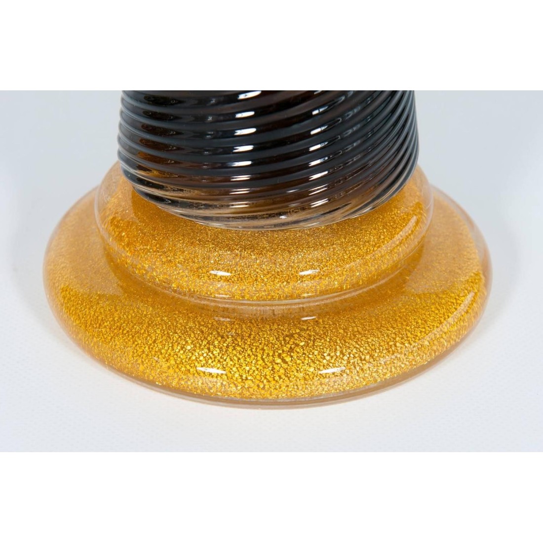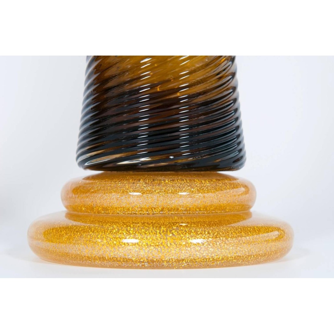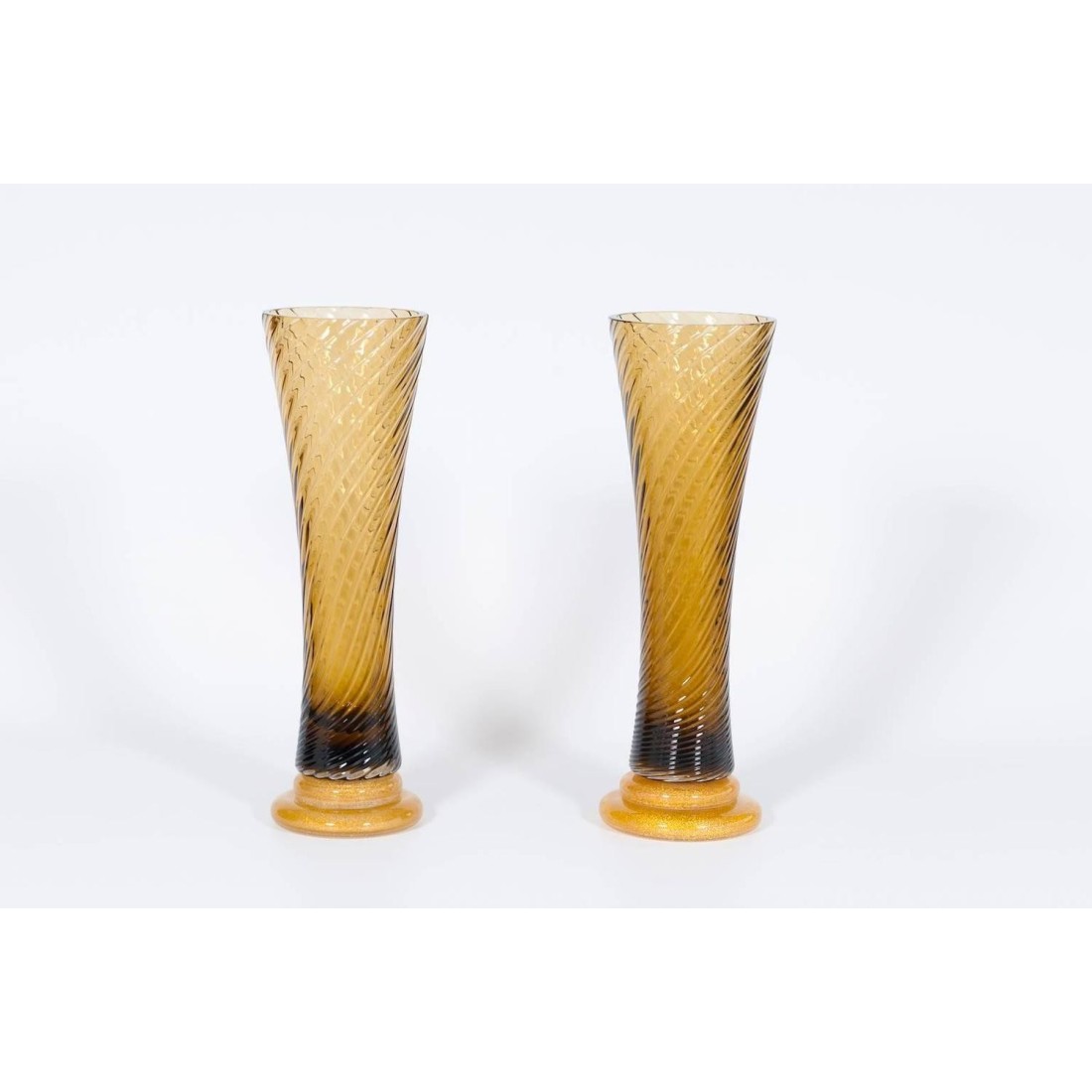 Giant Pair of amber Glasses Vase in blown Murano Glass 1980s. Pair of elegant Italian Murano glass vases in amber and gold. Fine and very thin and long amber glasses in a twisted handcrafted blown Murano glass coupled in a gold basement entirely handcrafted in blown Murano glass too. The pair is a wonderful set, in perfect conditions as documented by the attached pictures. Their manufacture is dated 1980s.