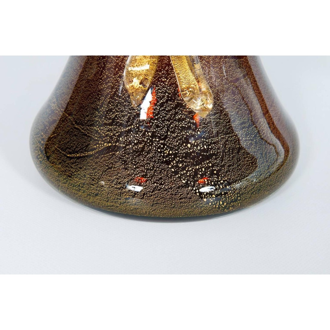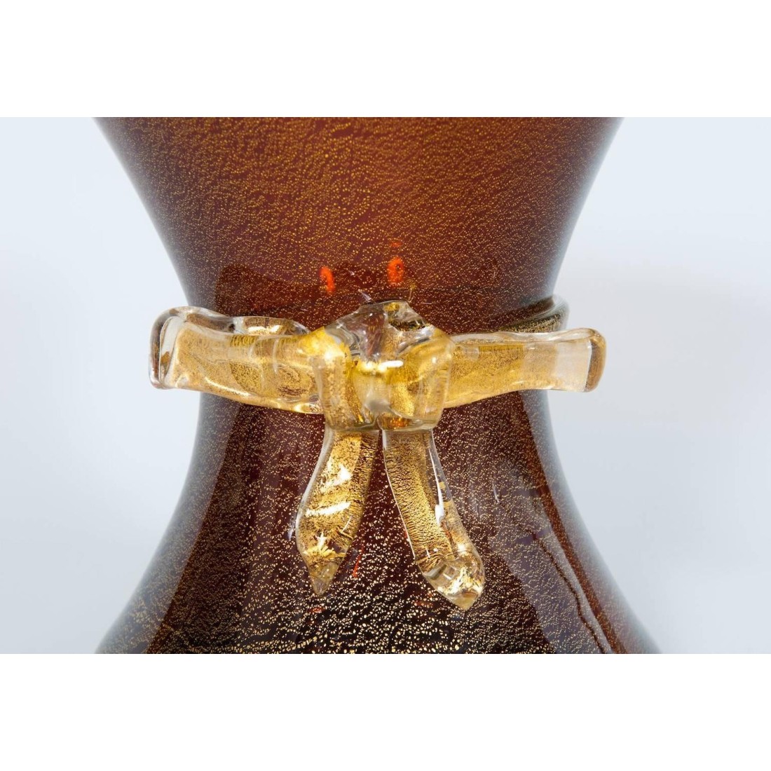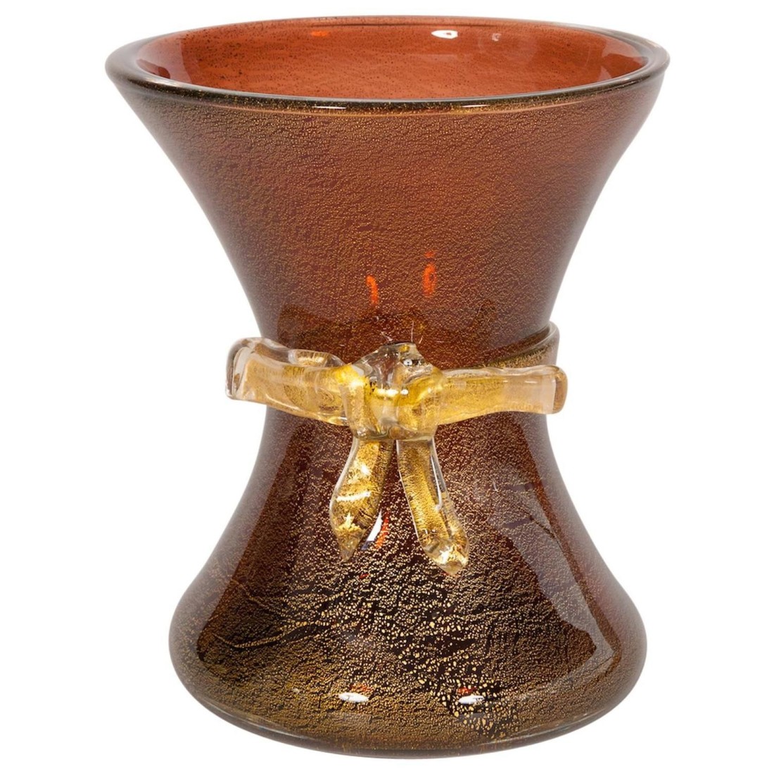 Vase with Bow Amber color and gold finishes in blown Murano glass 1970s Italy Elegant Italian Murano glass vase in gold and amber color with a beautiful gold tape in the middle. The vase is 10.63 inches high, by 9.06 inches diameter. This exclusive work of art is entirely handcrafted in blown Murano glass in the venetian island of Murano and its manufacture is dated 1970s. The vase is in excellent conditions as documented by the attached pictures.