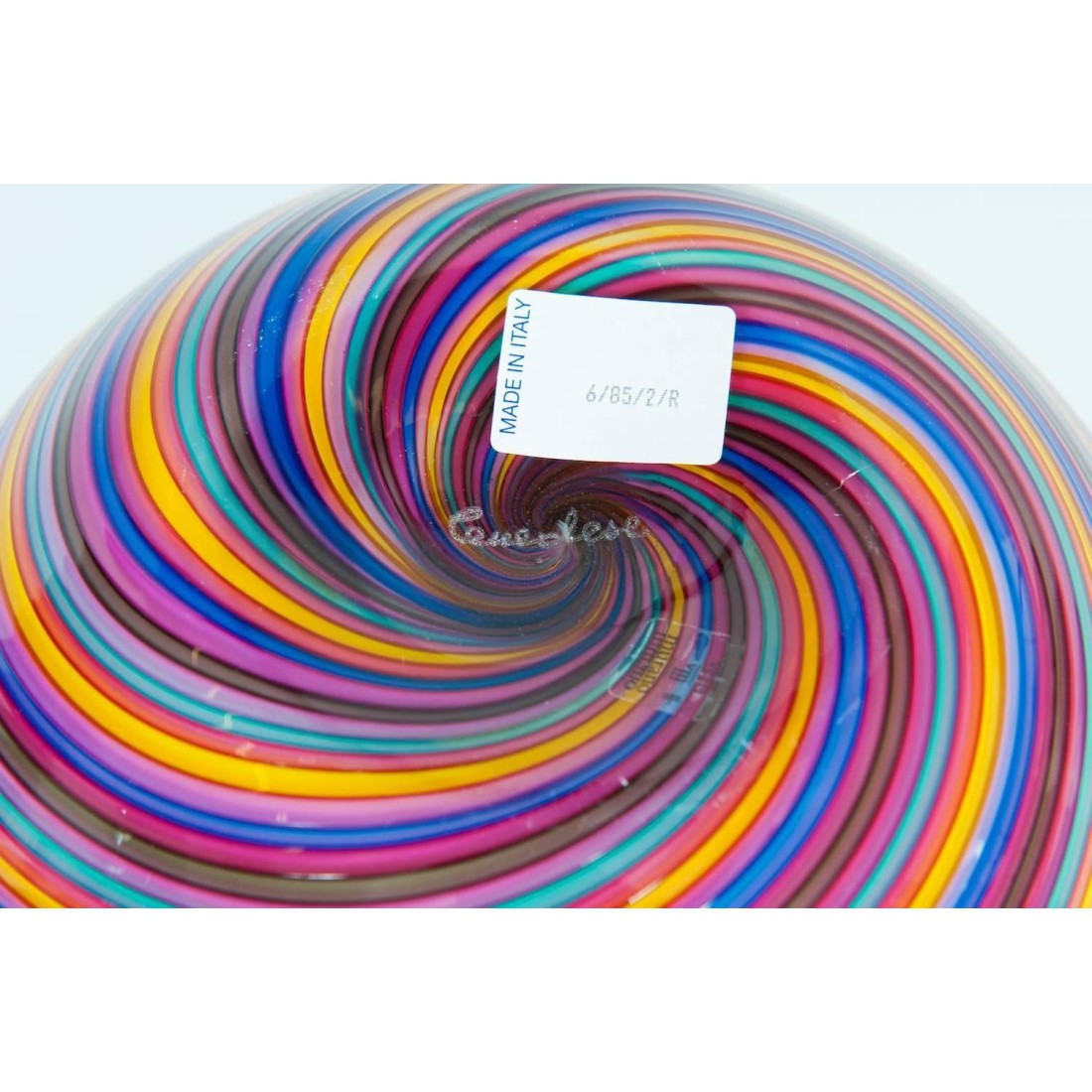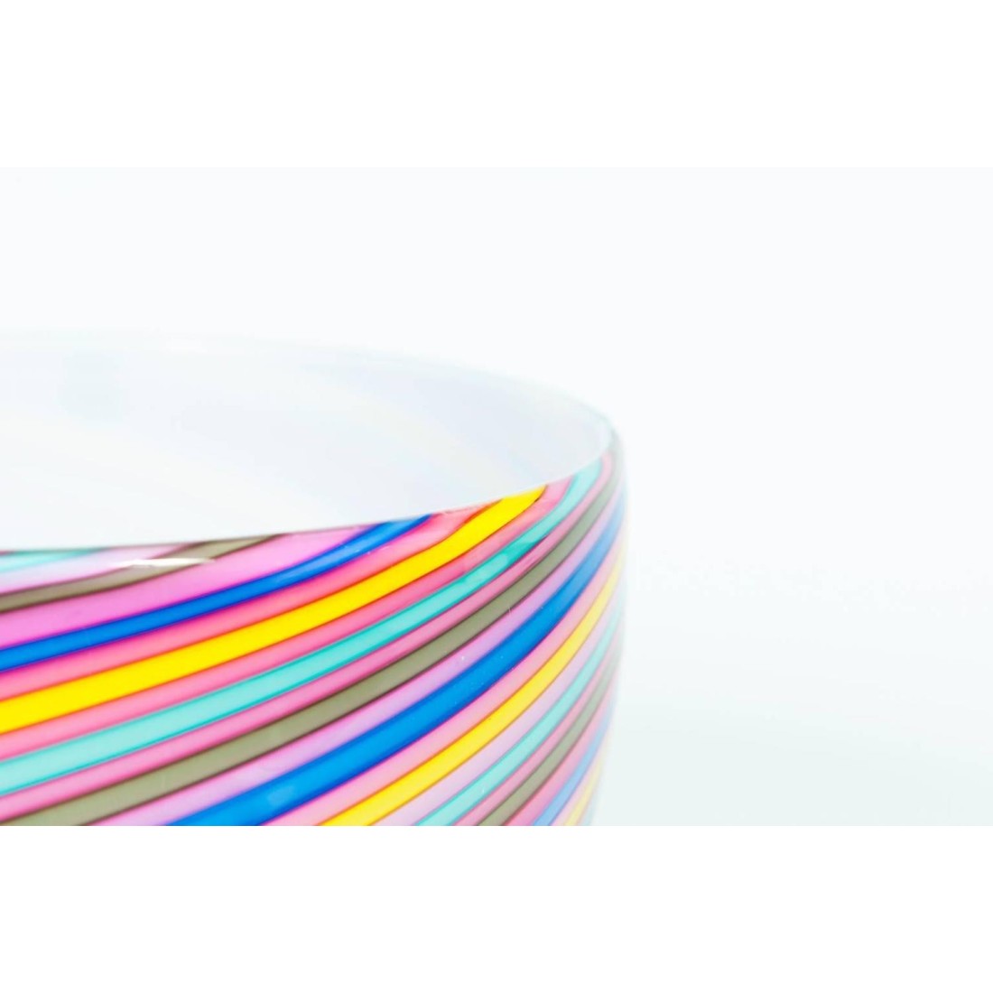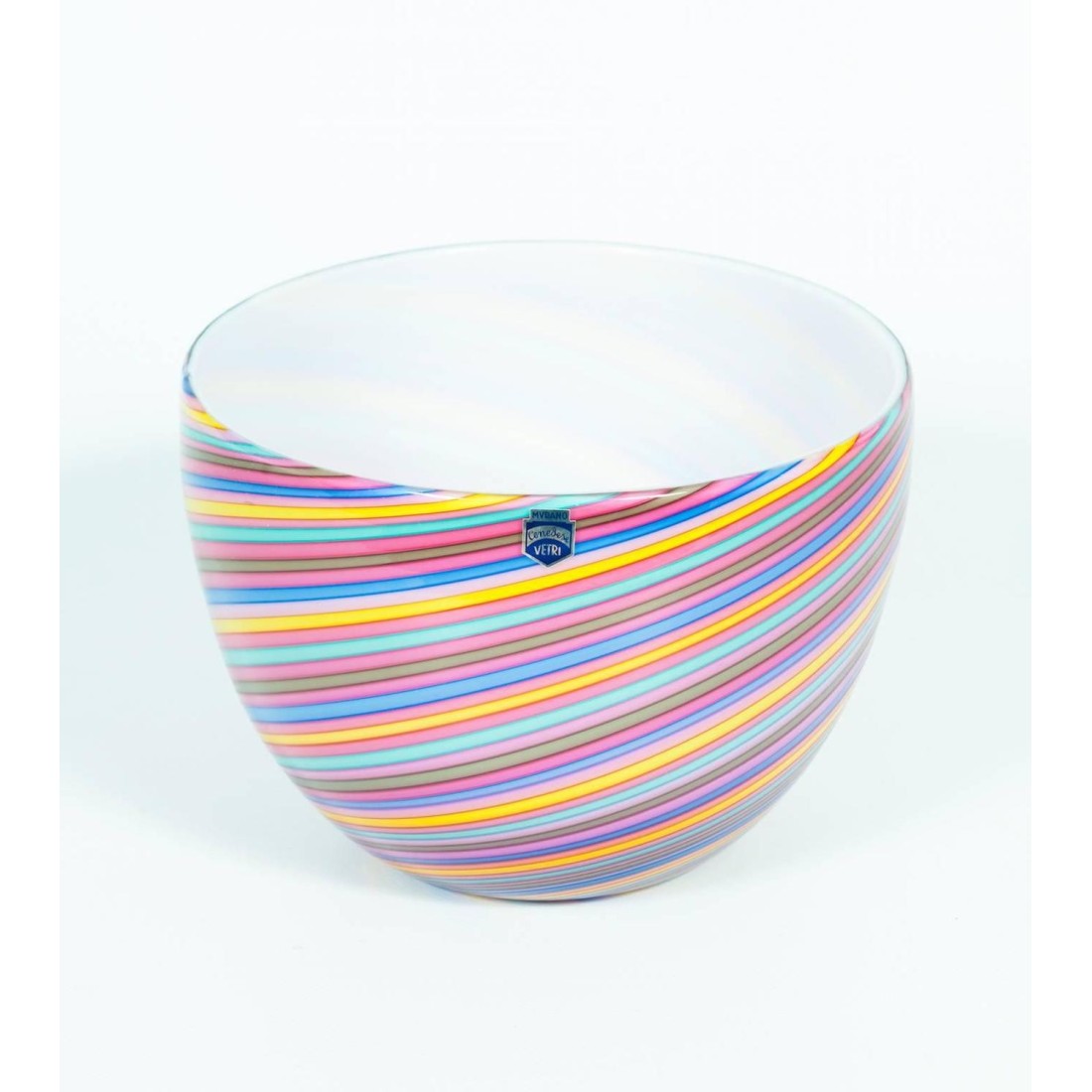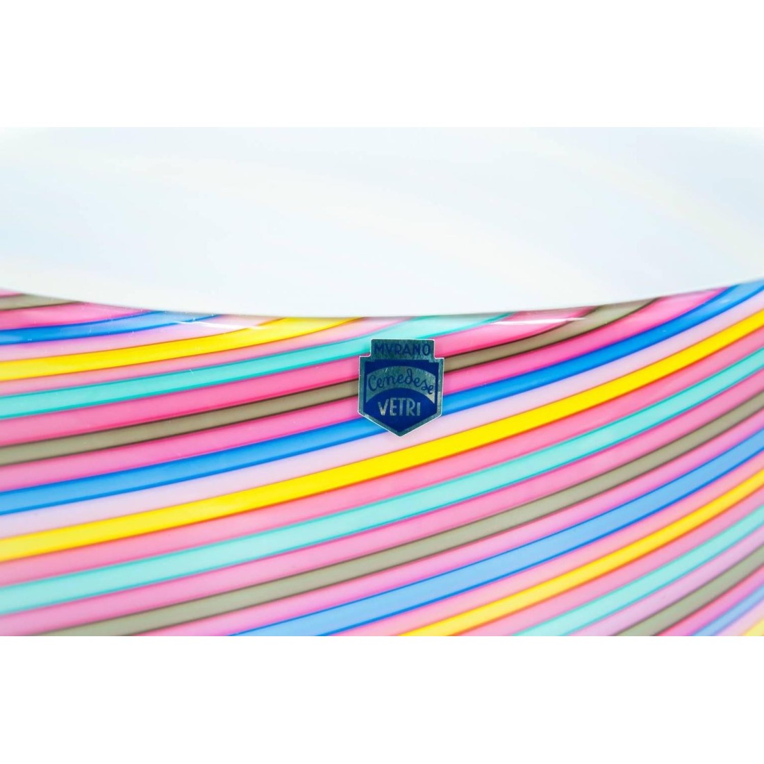 Pair of Italian Venetian blown Murano glass bowls pink rainbow by Cenedese, 1970s. Unique elegant bowls with twisted stripes in pink rainbow colors, in very excellent original conditions, as represented in the pictures. The bowls are in original blown Murano glass, entirely handcrafted and manufactured in the Italian island of Murano by Cenedese. The labels are the prove of the vintage manufacture of the bowls. Both are also signed in the bottom, as represented in the pictures.