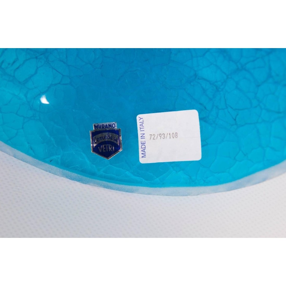 Italian light blue vase with cracks blown Murano glass, signed Cenedese, 1970s. This is an authentic modern vase, with fake cracks effects on the surfaces, that make it authentically exclusive. The masterpiece is in light blue color, entirely hand crafted in blown Murano glass, by the Murano artist Cenedese. Its manufacture is from 1970s. The product is in perfect conditions as documented by the attached pictures. Elegant Italian Venetian vase in blown Murano glass, light-blue with veins, in very excellent original condition as represented in the pictures. Having the original label of the maker, and signed in the bottom. The portrait is by a huge bowl accommodate in a same basement.