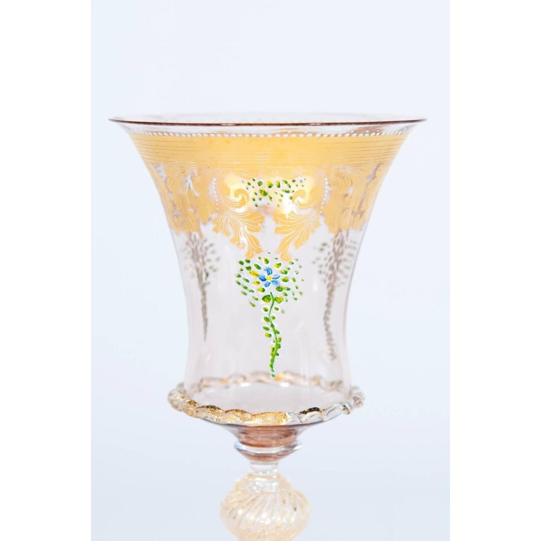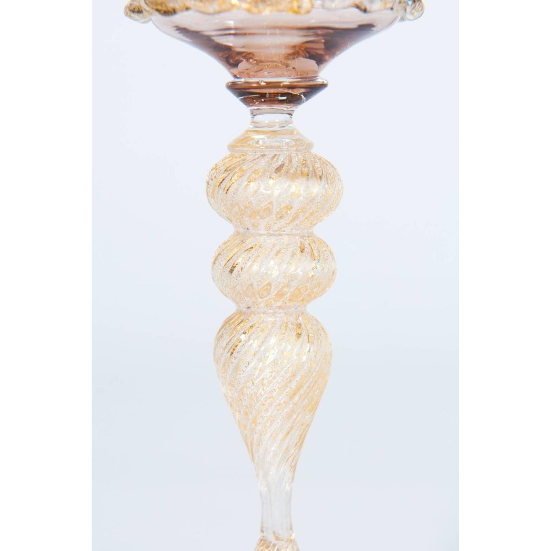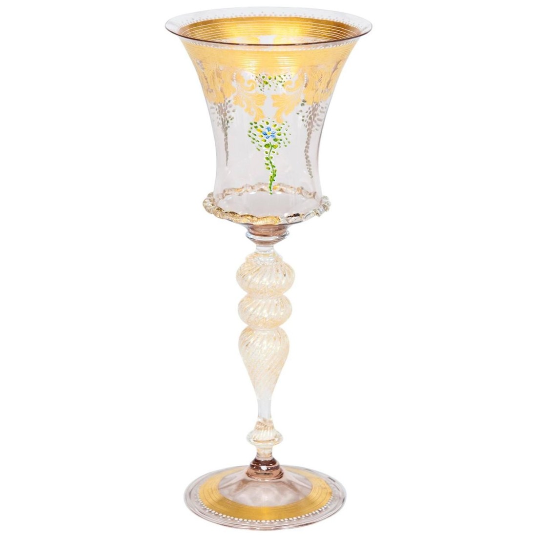 Fine and unique Italian Venetian handblown goblet in Murano glass in very excellent original condition, circa 1970s having a light-pink base and a gold stem, and a light-pink cup on the stem. The base and the cup have a very sophisticated artistic drawings handcrafted with a very amazing precision. The goblet is 9.45 inches high, by 3.86 inches diameter.