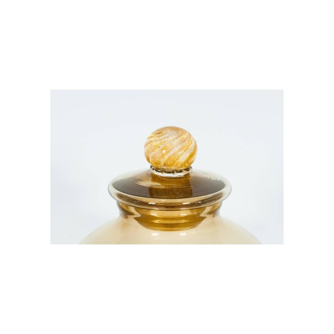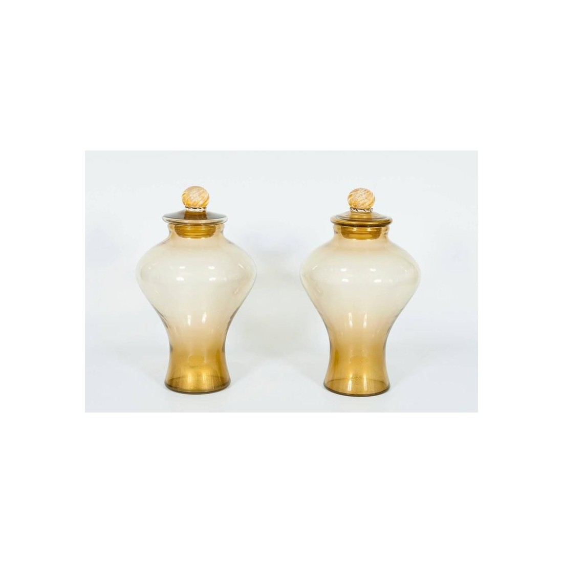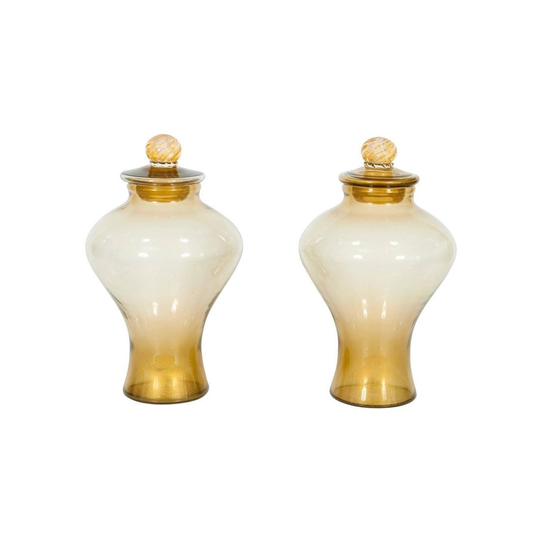 Amazing pair of Italian vases in transparent Murano glass and 24-Karat gold. Composed of two vases and two elegant covers. All parts were blown and handmade on the island of Murano, circa 1960s. The vases are in perfect, original condition.