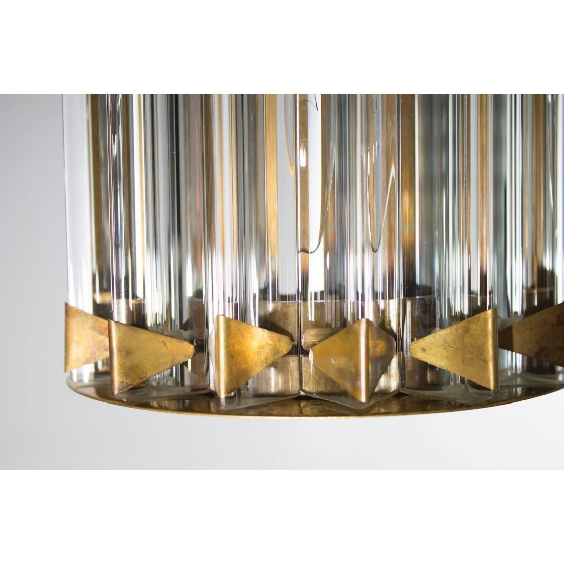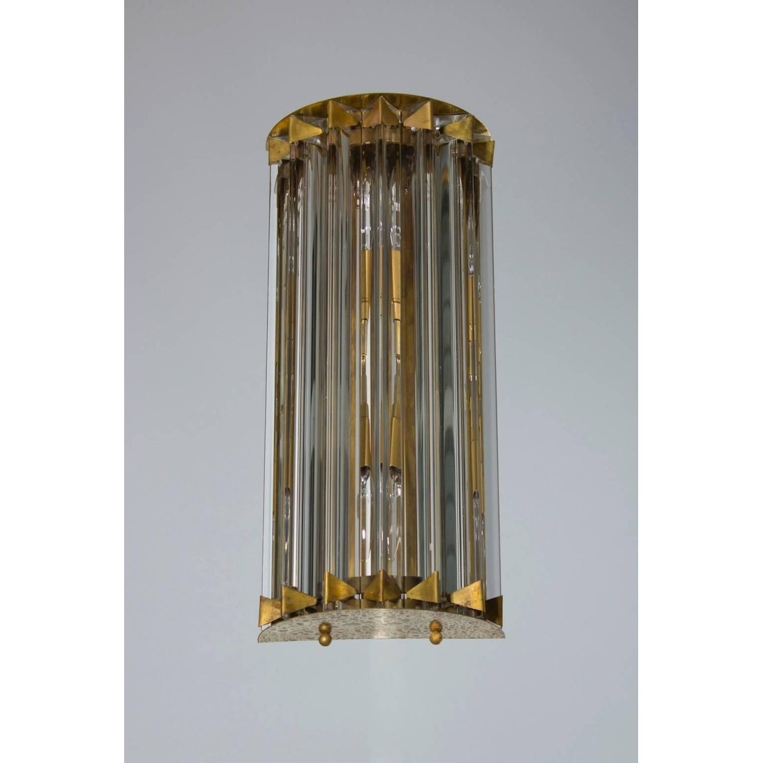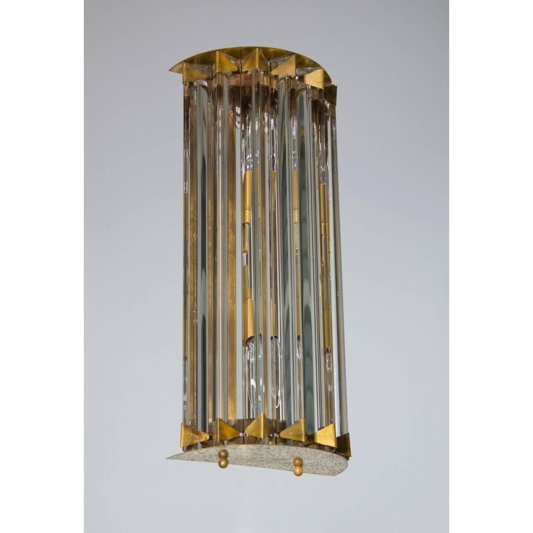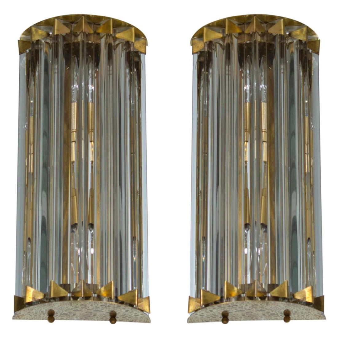 Pair of Italian sconces in Murano glass attributed to Camer Glass 1960s, Italy. This gorgeous pair of Italian Murano sconces is attributed to Camer Glass. The sconces are composed of clear glass Triedro elements, forming two semicylinders, and their amazing original brass frames. The two sconces are 17 inch high, 4 inches deep and 7 inches wide. They have two lights. The sconces are in excellent conditions as documented by the attached pictures. The professional rewiring of the sconces, based on your country’s specifications, is included in the service as our courtesy.