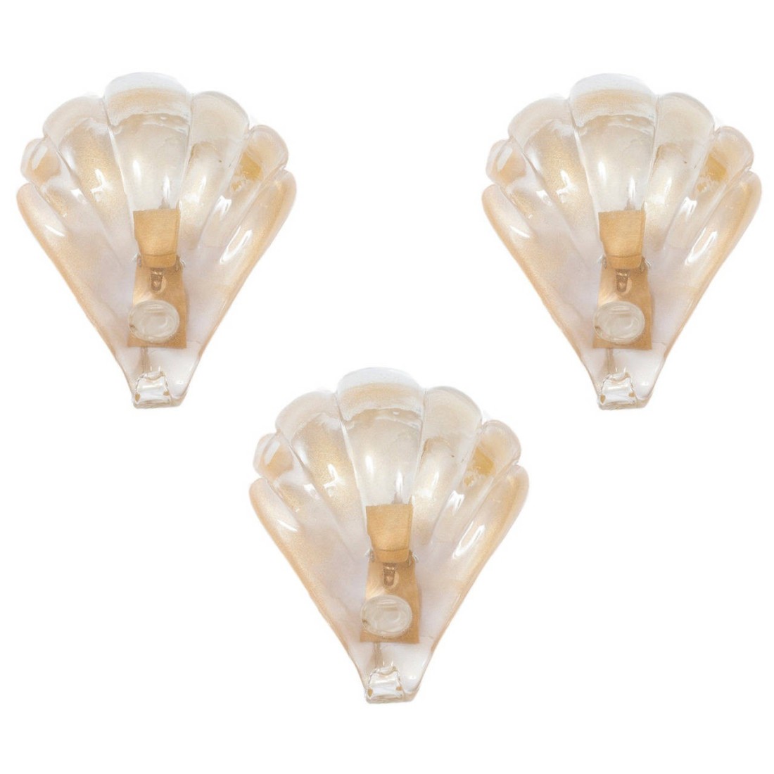 Set of Shell Sconces in Blown Murano Gold Glass 1960s Italy. The sconces are huge shells, accommodated in a elegant gold brass framework. These amazing sconces, having a unique shape of gold shells, they have been entirely manufactured handcrafted in the Italian Venetian Murano Island, in the 1960s, attributed to the famous designer of the blown Murano glass art Barovier & Toso. The sconces are made up of only blown Murano glass, submersed in a gold film which gives this wonderful color to all of them. These sconces are very robust, so they are also adapt to be installed in a outside environment, for instance a yard, or gardens, patios. The three sconces are in excellent conditions, as documented in the attached pictures. The rewiring of the sconces based on your country's specifications is part of the service.