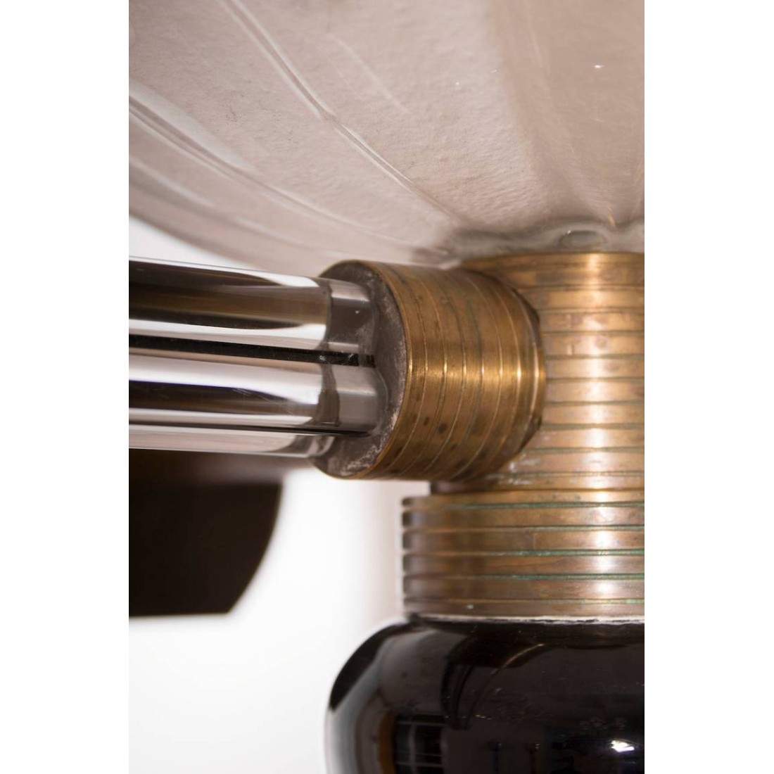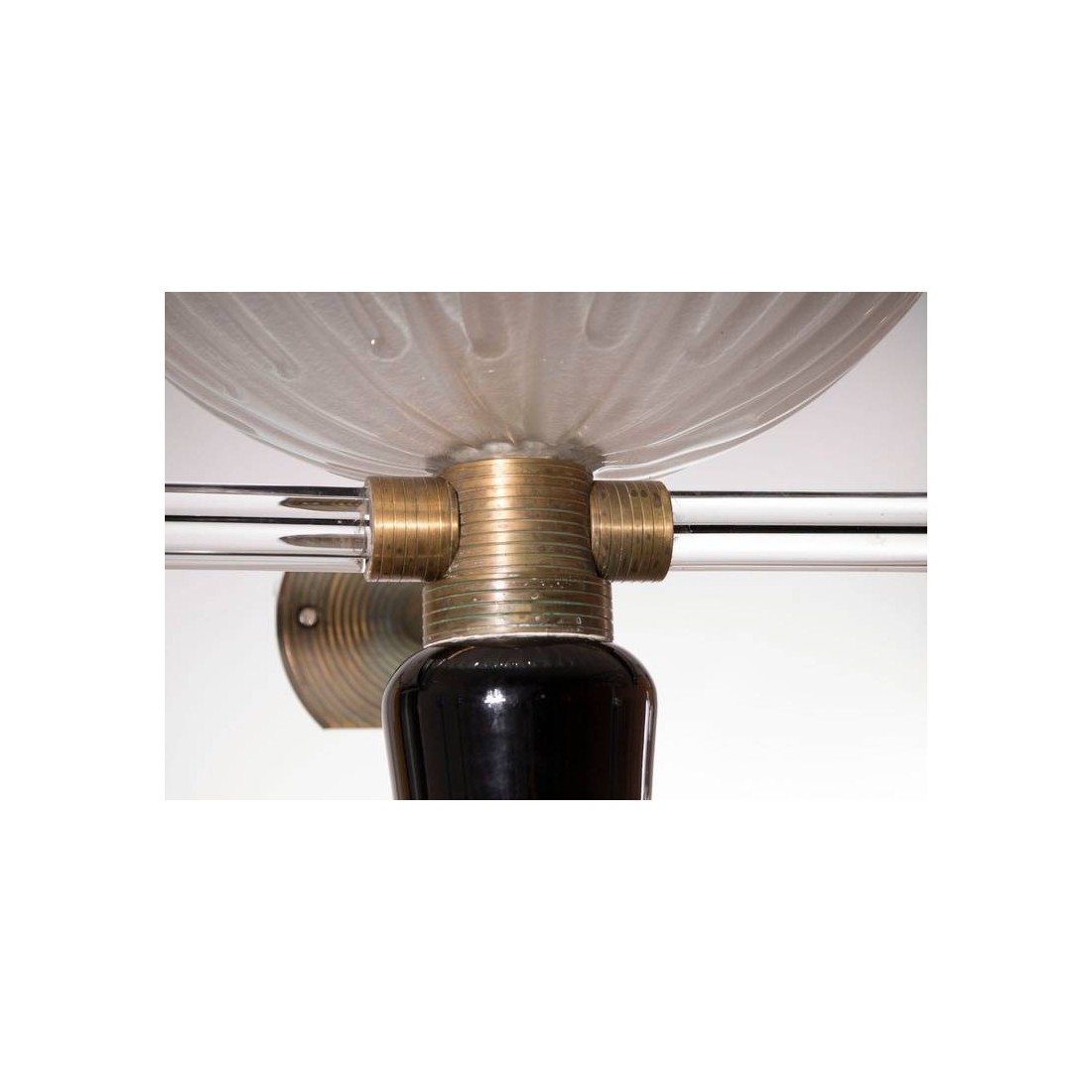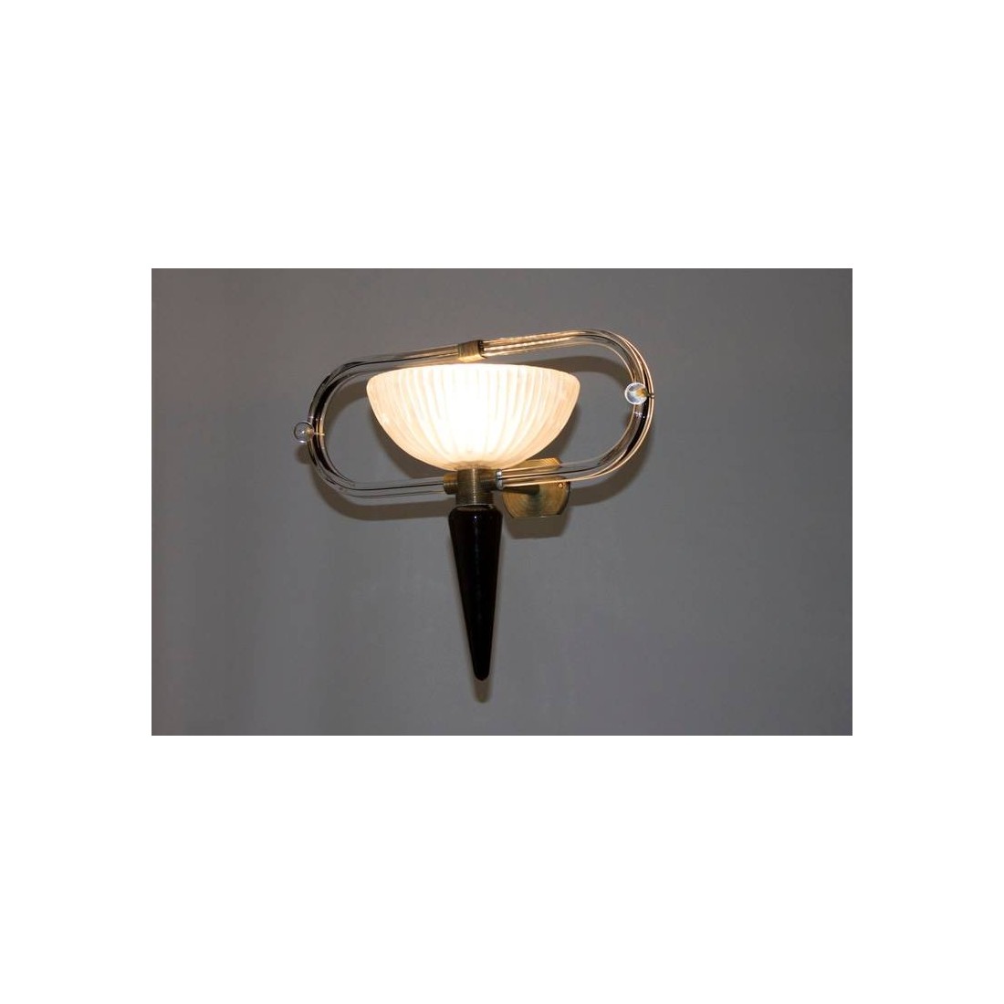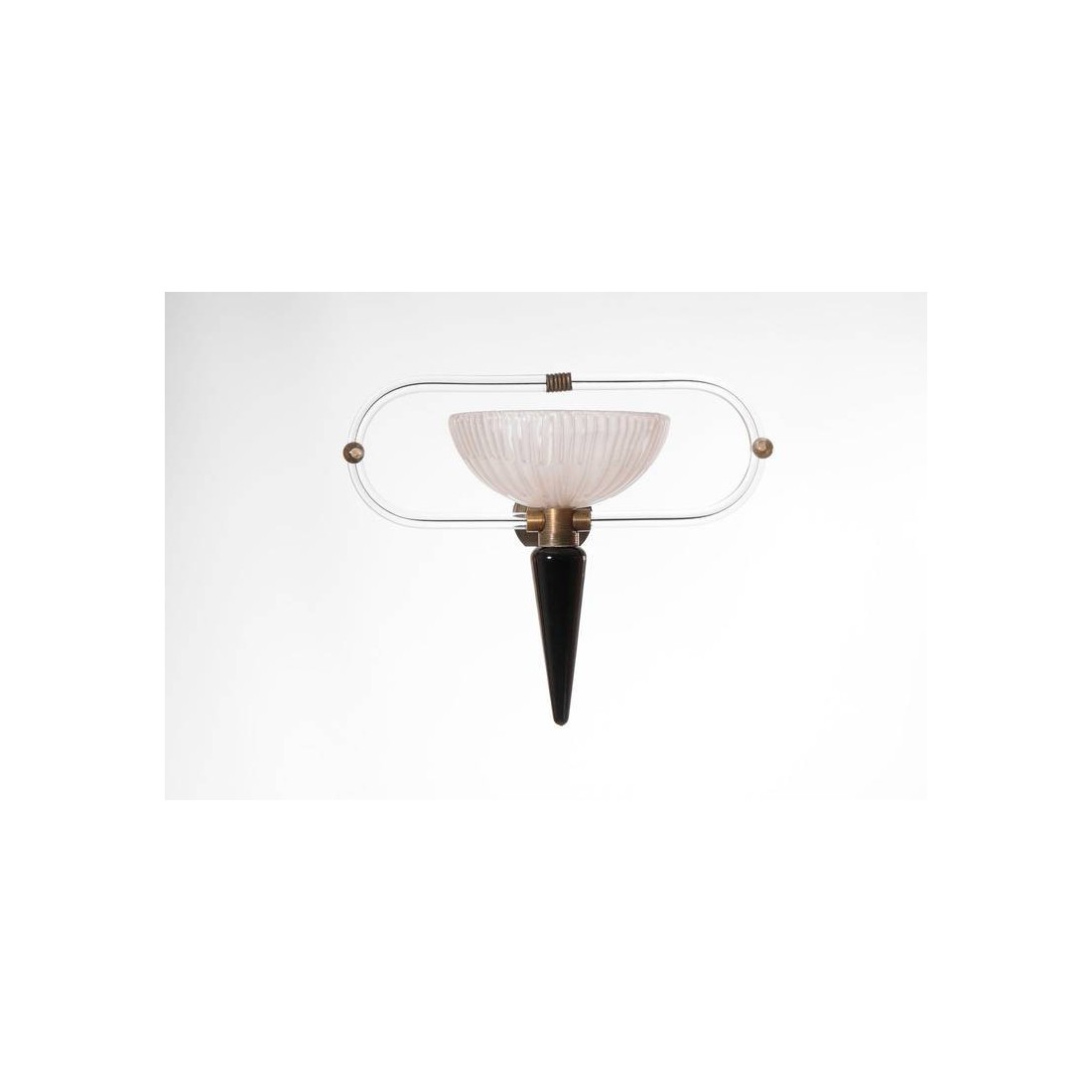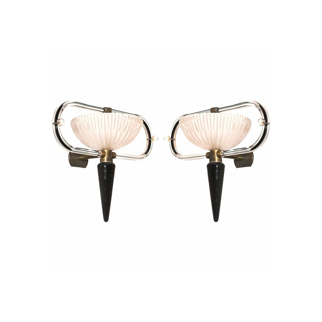 Modern and elegant Italian Venetian, pair of sconces, blown Murano glass, black and white, attributed to Camer Glass, 1960s. Pair of Murano Glass sconces, attributed to Camer Glass, composed by a huge ''acidified'' glass cup having two transparent and black curved quadriedro curves, with in the middle a transparent glass sphere decorating the two sides. Each sconce's frame is entirely handcrafted in brass, that joins together in a unique and exclusive masterpiece the huge glass cup with their curves and the bottom black cone. All the parts of the sconces, included the bottom cone, the glass cup and the glass curves, are entirely handcrafted in blown Murano glass, in the Venetian island of Murano, and their manufacture is attributed to the designer Camer Glass, and dated 1960s. The pair of sconces is in excellent original conditions, as documented in the attached pictures. It is part of our courtesy service the professional rewiring for the pair of sconces, based on your country's specifications.