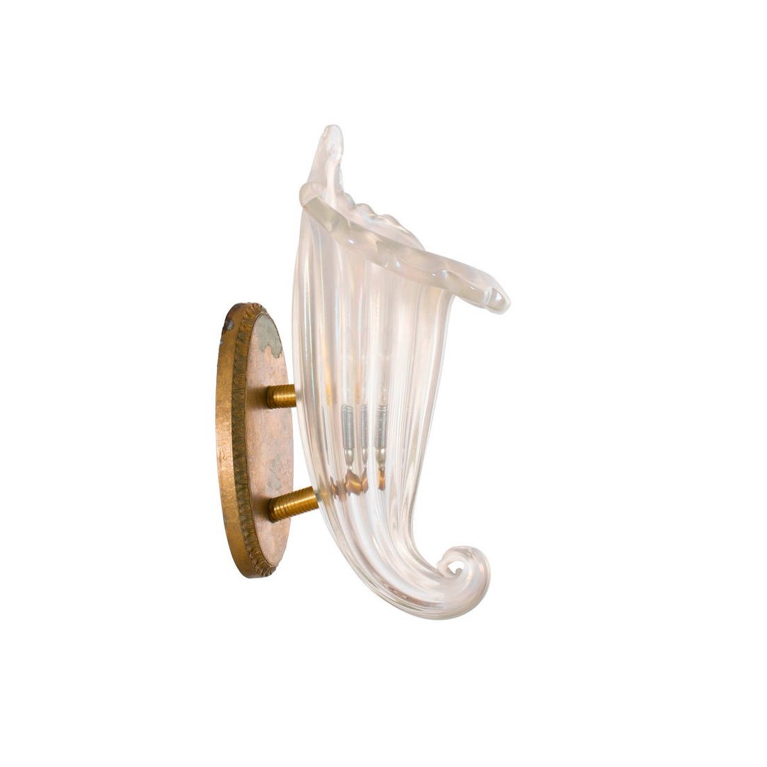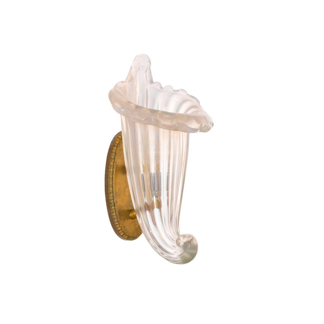 Set of four Iridescent Seashell sconces in blown Murano Glass 1980s Italian Venetian blown Murano glass sconces, attributed to Romano Dona`, circa 1980s, composed by a seashell in iridescent color supported by a vintage brass frame, with one light. Each sconce is 18 inches high, 11 inches deep by 10 inches wide. These masterpieces are handcrafted, in blown Murano glass manufactured by the antique traditions of the blown glass in Murano Island, by the school of Romano Donà. All of them are in excellent conditions, as documented in attached pictures. It is included in our service the professional rewiring based on your country's specifications.