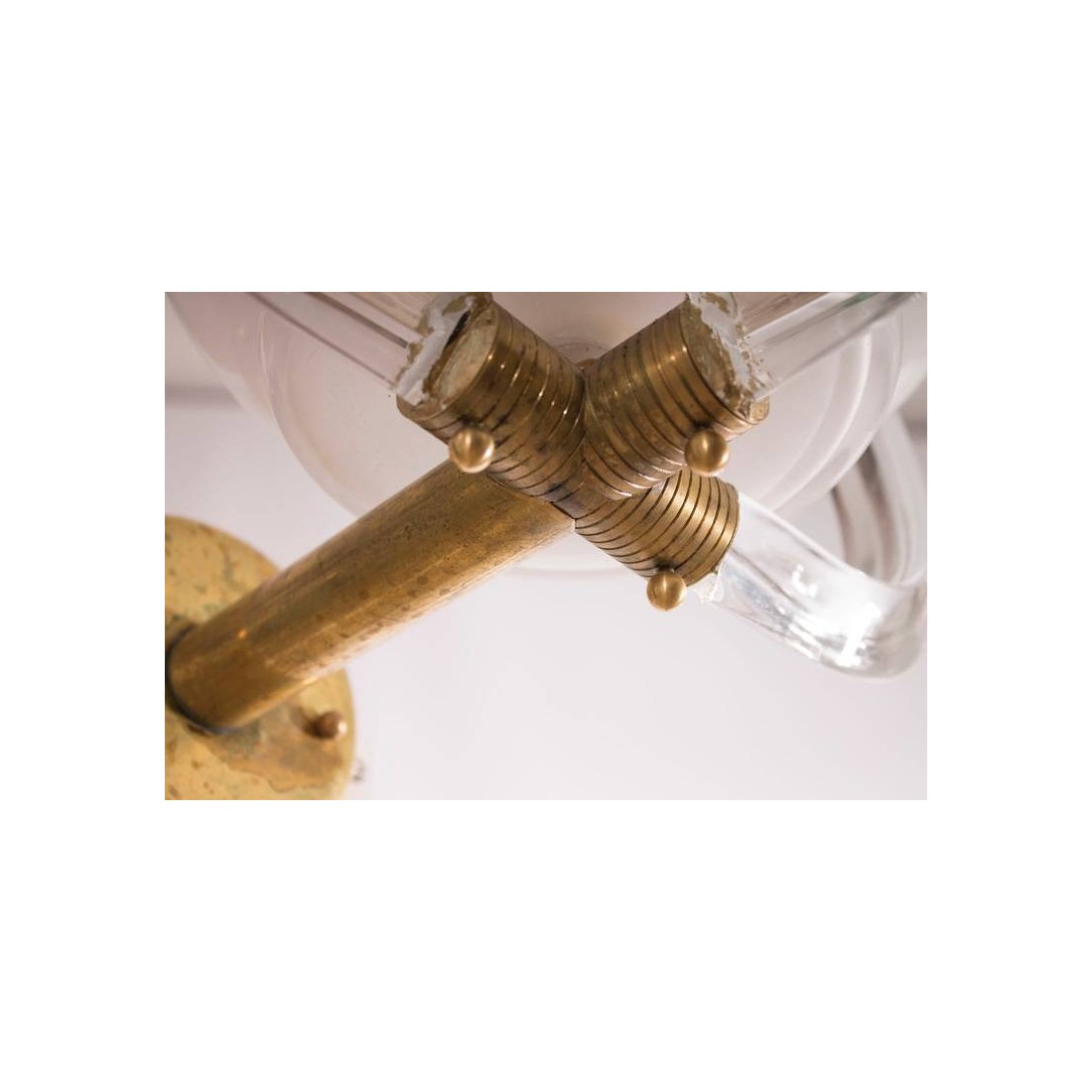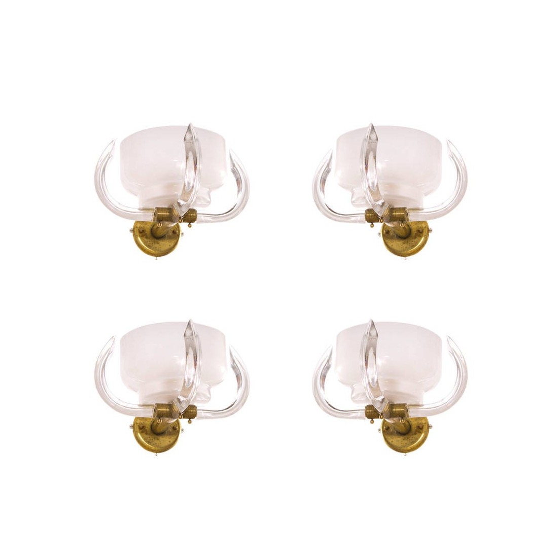Amazing Italian Pair of Sconces in blown Murano Glass White color, Camer Glass, 1960s, constituted of a main huge white bowl, surrendered by three Triedro curved, joined together by a massive original brass frame; inside each one there is one light. These pair of sconces are entirely handcrafted, in blown Murano glass, in the Italian Venetian island of Murano, attributed to Camer Glass, dated 1960s. They are in very excellent original condition, as represented in the attached pictures. We offer for free the professional rewiring based on your country's specifications.