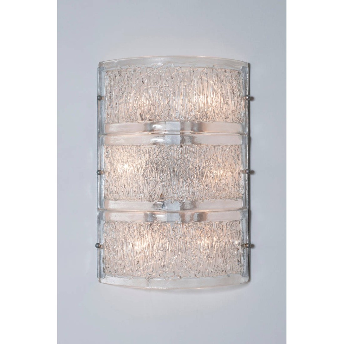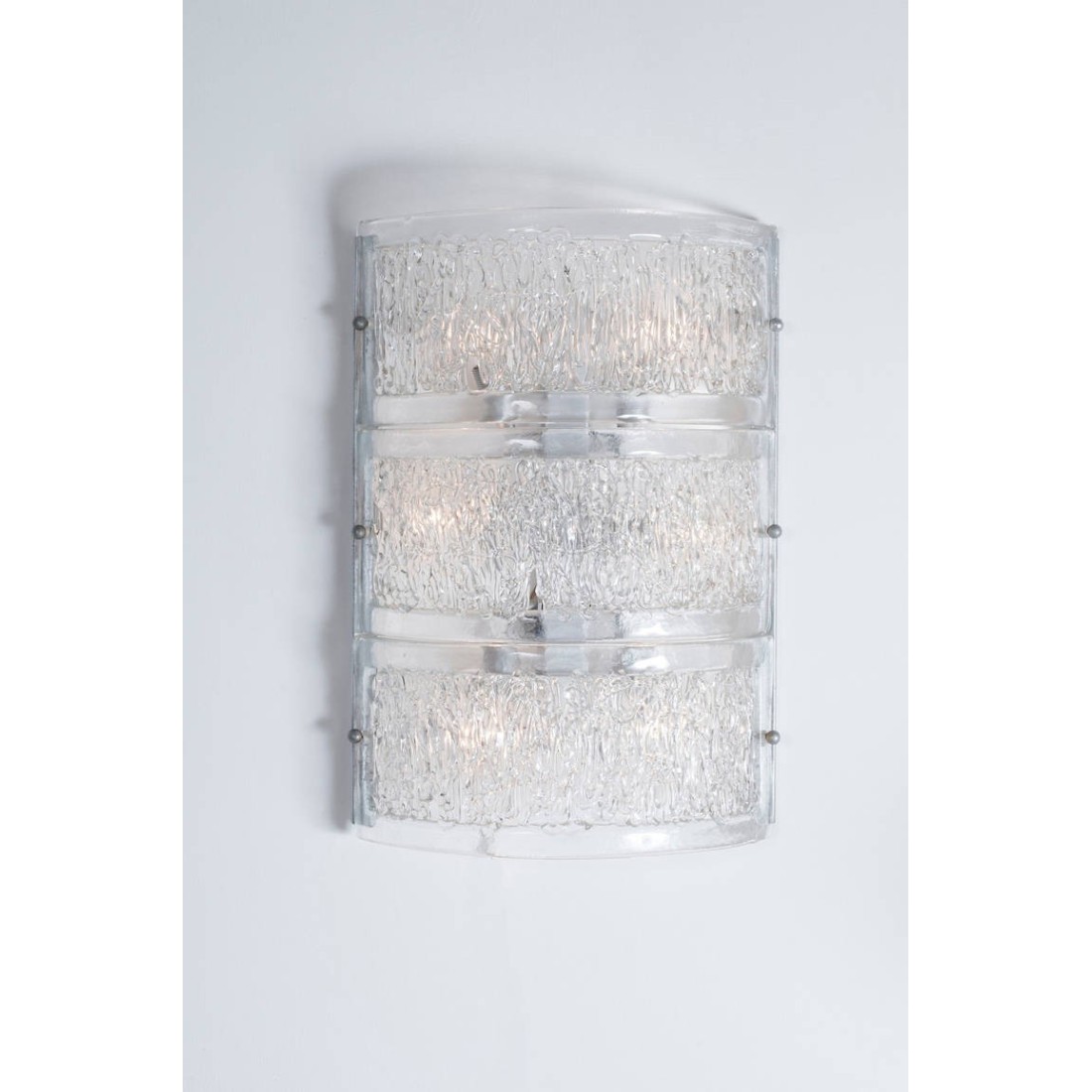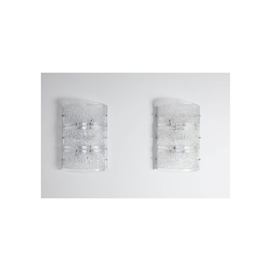 Amazing Italian set of 4 sconces in blown Murano Glass clear color attributed to Mazzega, circa 1970s, having elegant three pantiles in transparent glass, with a frame in grey color, in excellent original condition, with six lights. These masterpieces are entirely handcrafted, in blown Murano glass, and their manufacture is attributed attributed to Mazzega, circa 1970s. The sconces are in excellence conditions as documented in the attached pictures. We offer for free the professional rewiring of these items based on your country's specifications.
